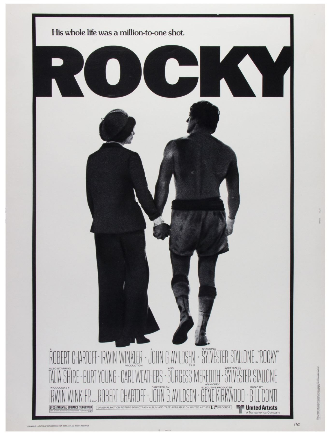 (United Artists, c.1976) A very rare 40"x30" theatrical release movie poster for the original "Rocky". Lithographically printed on cardstock and issued by the National Screen Service, this original poster is in very god condition with minor creasing and scuffs to the poster, and some edge-wear. The reverse of the poster has some yellowing and a black smudged area.