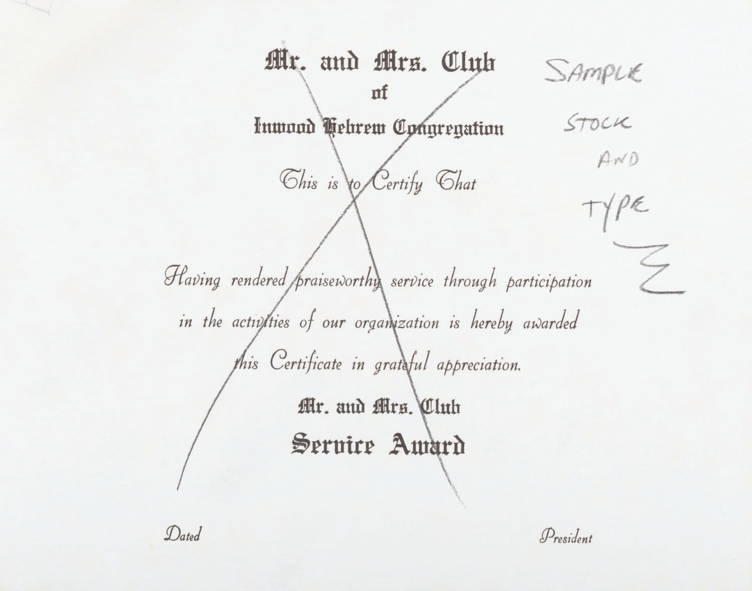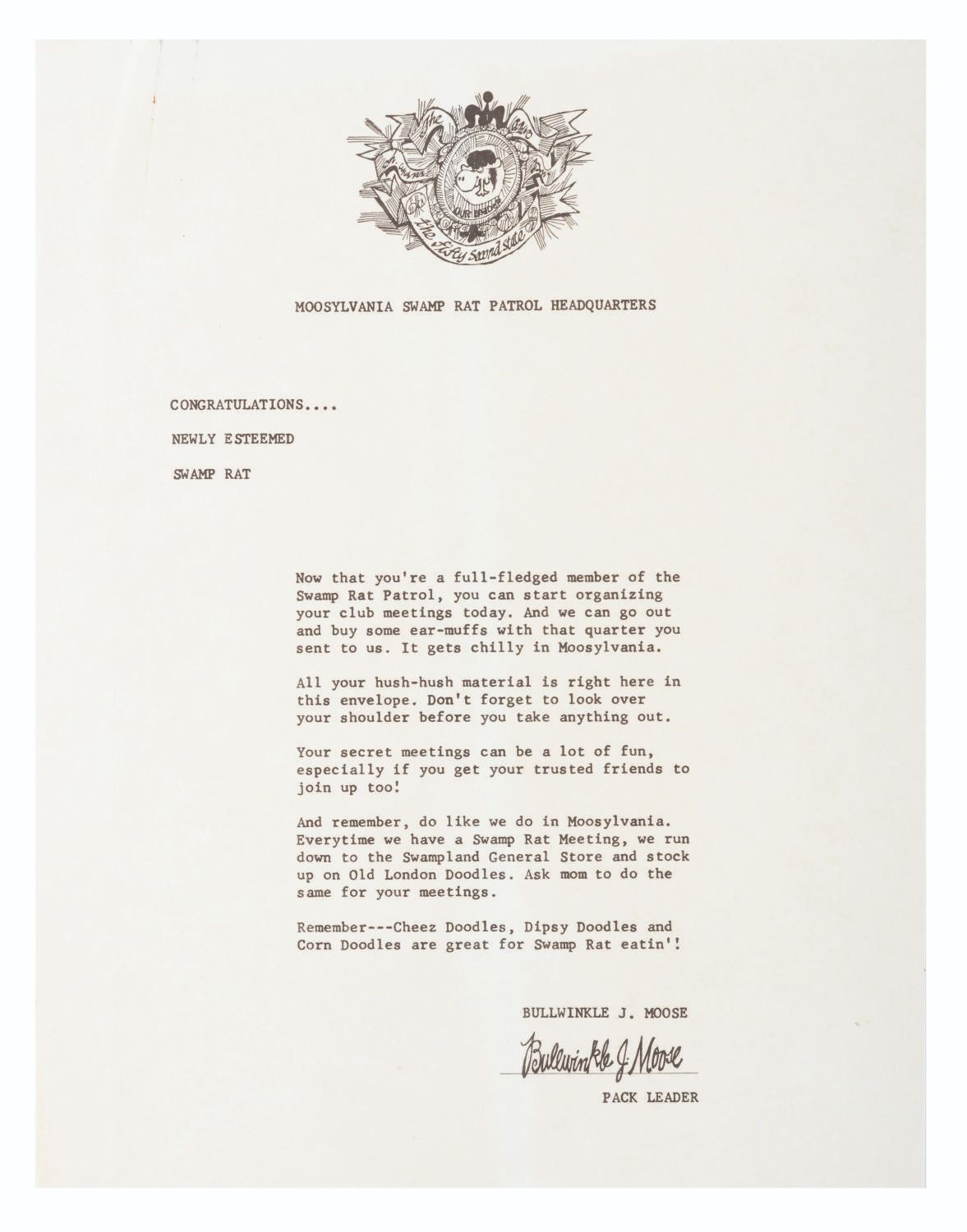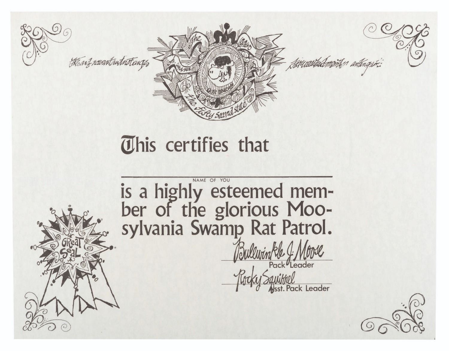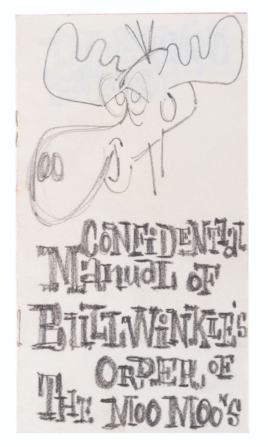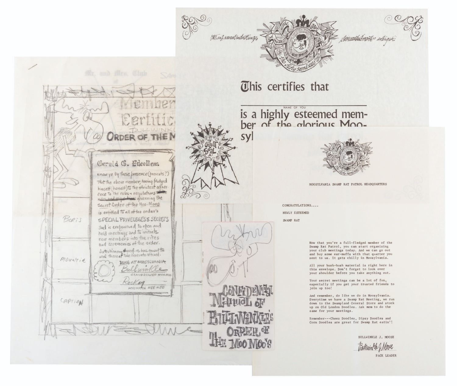 (Ward, 1960s) A pair of documents from the "Swamp Rat Patrol" Bullwinkle fan club, along with two concept drawings for an unused “Moo Moos” fan club by Allan Burns and Sam Clayberger. Included are a letter and membership certificate for the Swamp Rat Patrol, which fans could join by sending in 25 cents. The concept art is for "Bullwinkle's Order of the Moo Moos" which was never launched, and includes a membership certificate and an 8-page blank booklet mock-up with pages for secrets, rules, and more. The Swamp Rat Patrol letter and certificate each measure 8.5" x 11" and are in very good condition with light wear from a paperclip. The 3" x 5.5" Moo Moos booklet and 11" x 14" certificate concept art are both accomplished in graphite and are in very good condition with typical production wear and a horizontal center fold to the certificate concept.