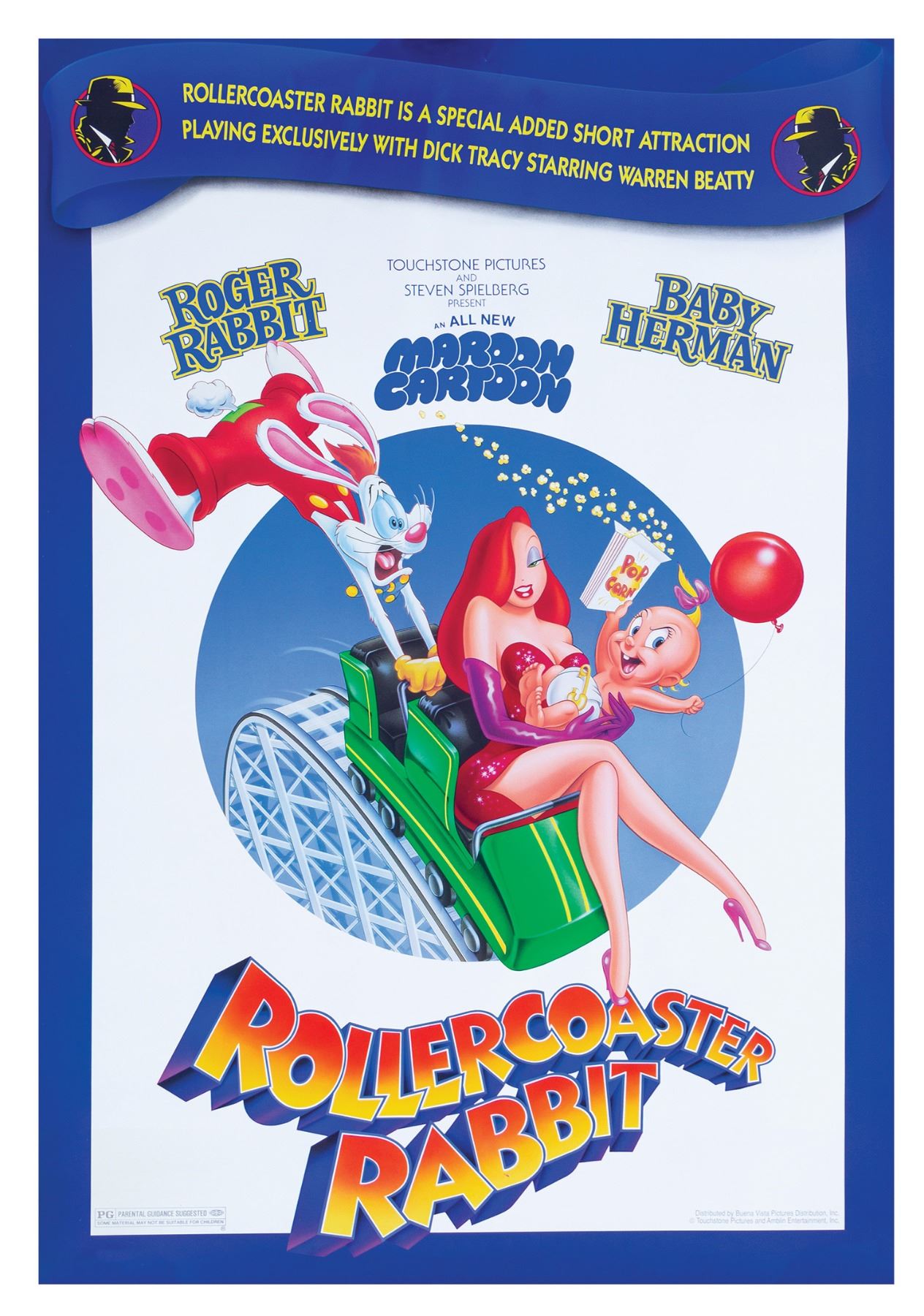 (Disney, 1990) An original one sheet poster for the Roger Rabbit and Baby Herman short Rollercoaster Rabbit. The short features the escapades of Baby Herman and Roger at a theme park, and was released with Dick Tracy in the hopes it would increase awareness for the feature film. Measuring 40"x27", the double-sided poster is in very good condition with minimal edge-wear and slight waving along the top edge. There is color wear along the top edge of the reverse.