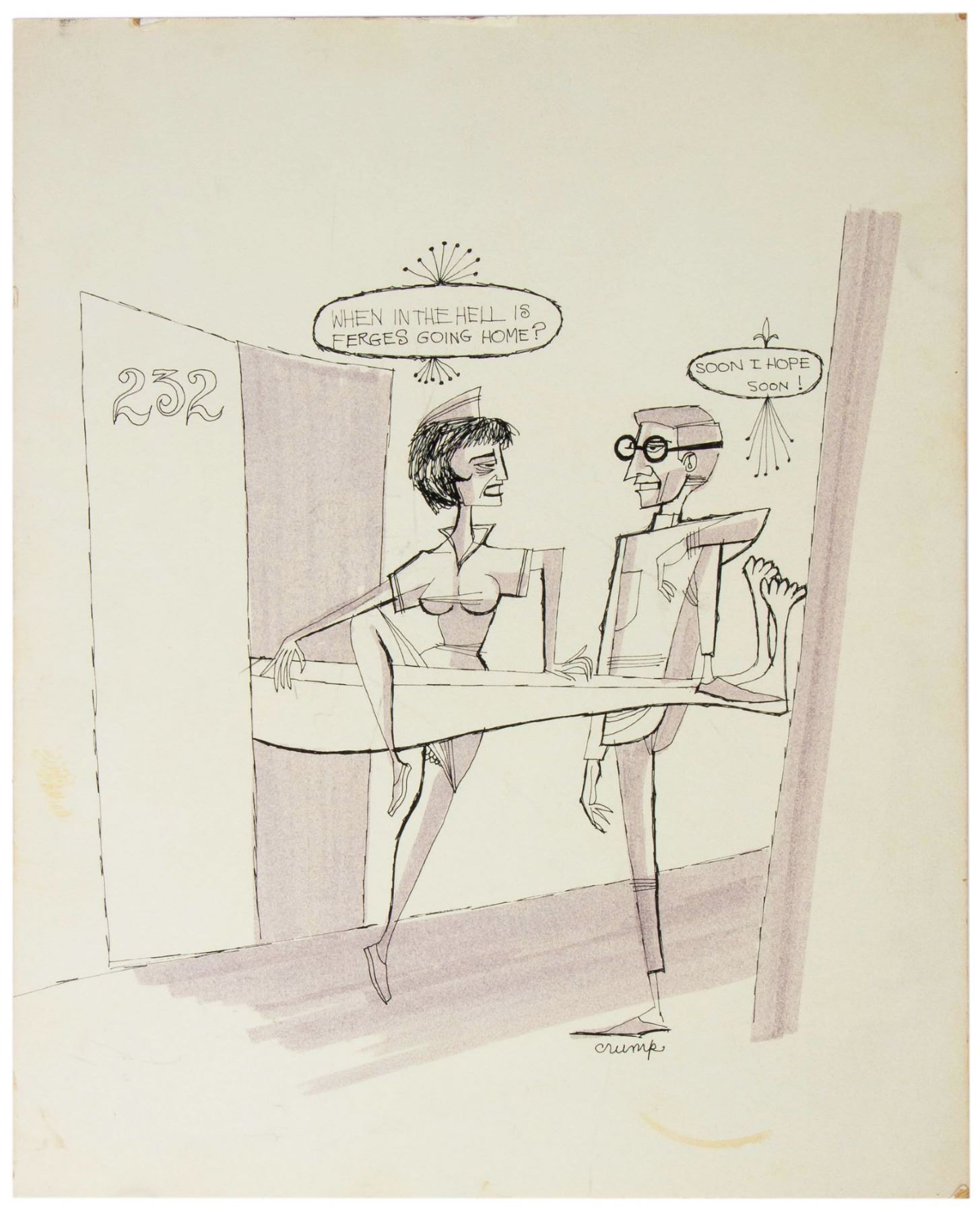 (c.1960s) An original illustration created by Rolly Crump for a "Get Well" card for fellow Imagineer Jack Ferges. The illustration features Ferges, who was over 6.5ft tall, with his legs sticking out from his hospital room as a Doctor and Nurse step over him. The artwork is accomplished in ink on artist's board, and measures 15"x12.25". The condition is good with minor wear from use, and the illustration is signed by Crump in the lower-right.