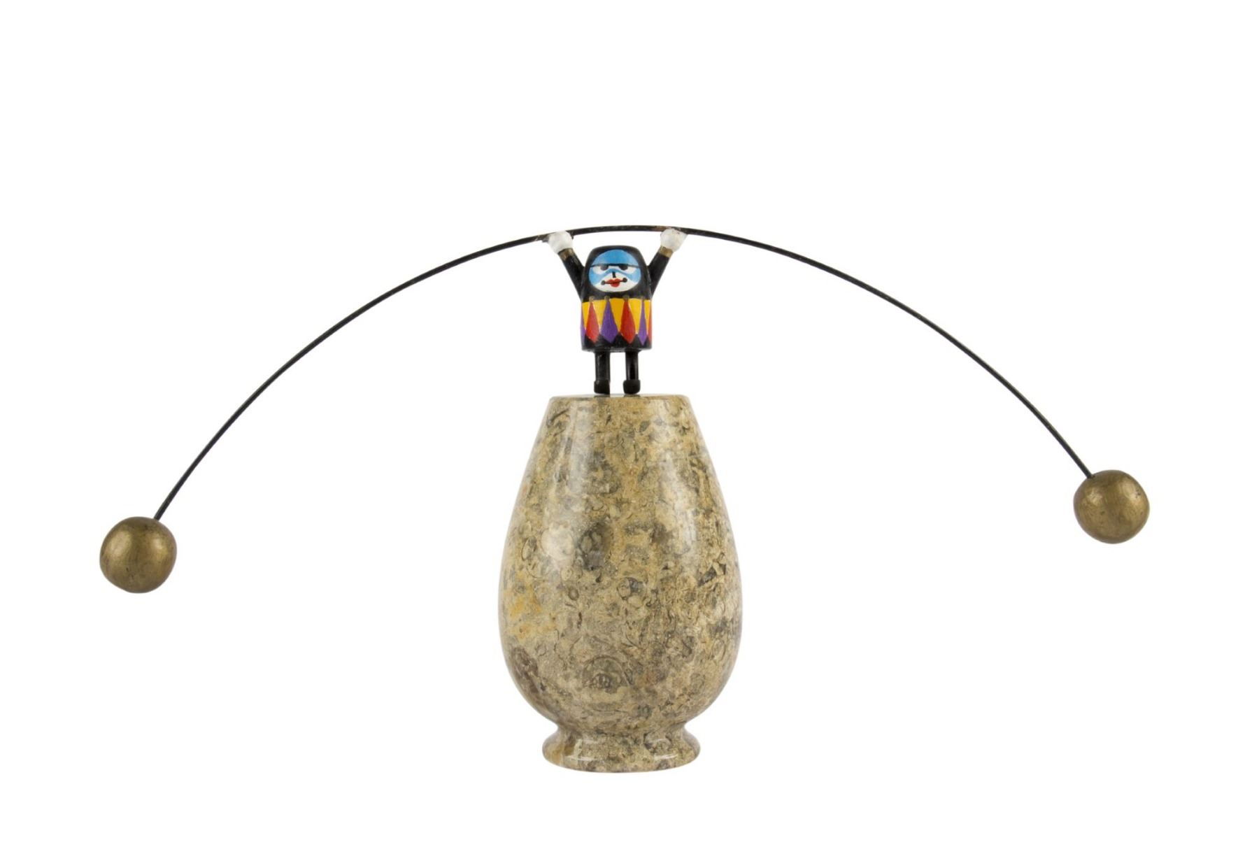 (1970s) An original balancing toy created and hand-painted by Rolly Crump. This toy depicts a weightlifter, and when one of the two weights are pushed, the figure wobbles and spins but doesn't topple. This toy measures 16.5"x5.5", not including the over-turned vase it stands on, and is in good condition with minor wear from age.