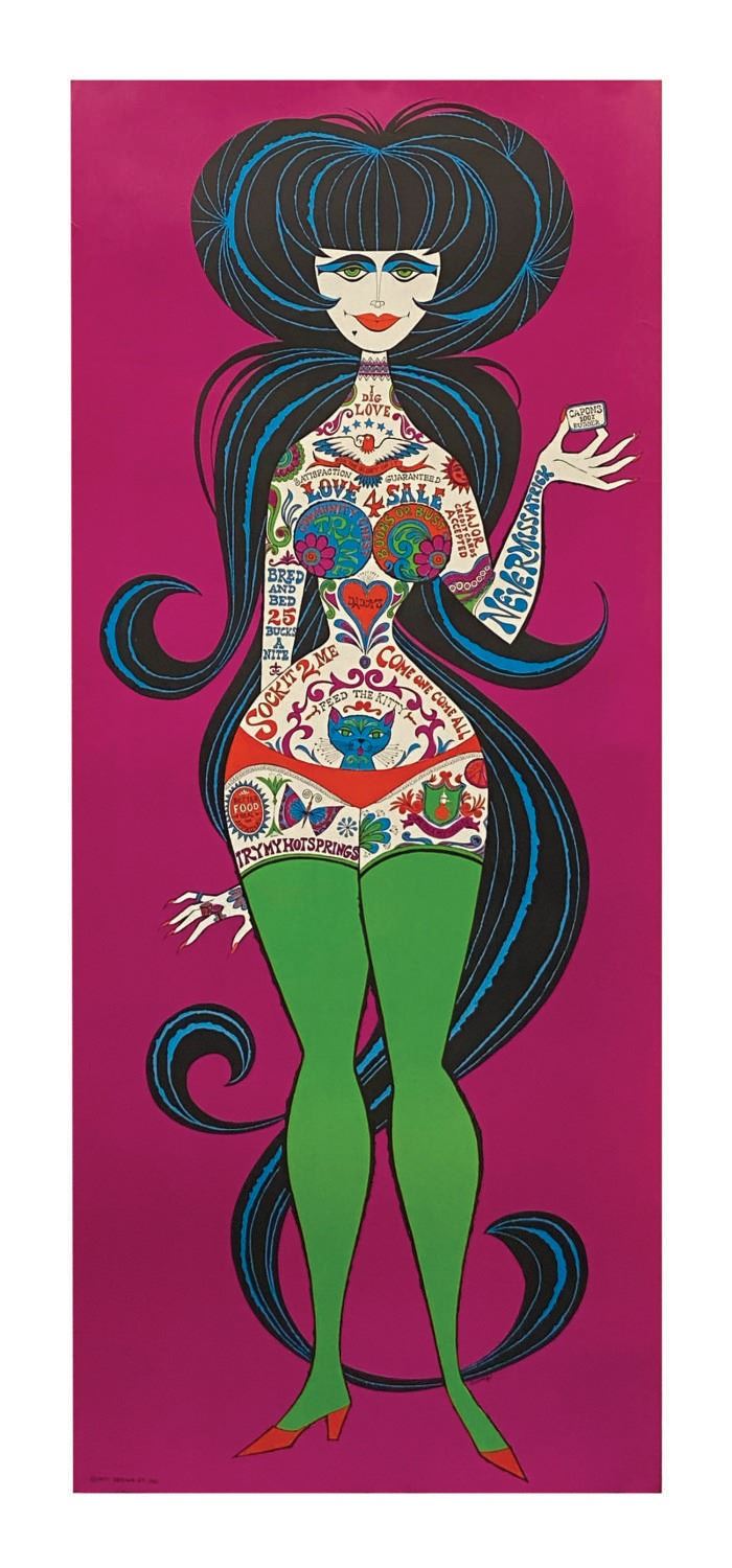 (Design 27, 1971) A vintage lithographic poster print by Disney artist and Imagineer Rolly Crump, titled Kitty Galore. Heavy in psychedelia and double entendres, Crump engages with the spirit of the times in this beautiful full-length portrait of a liberated love goddess. Measuring 57.5"x24", the poster is in very good condition with some marginal tears, water staining to the extreme edge of the reverse at right, right has lightly browned the front, and general edge wear.