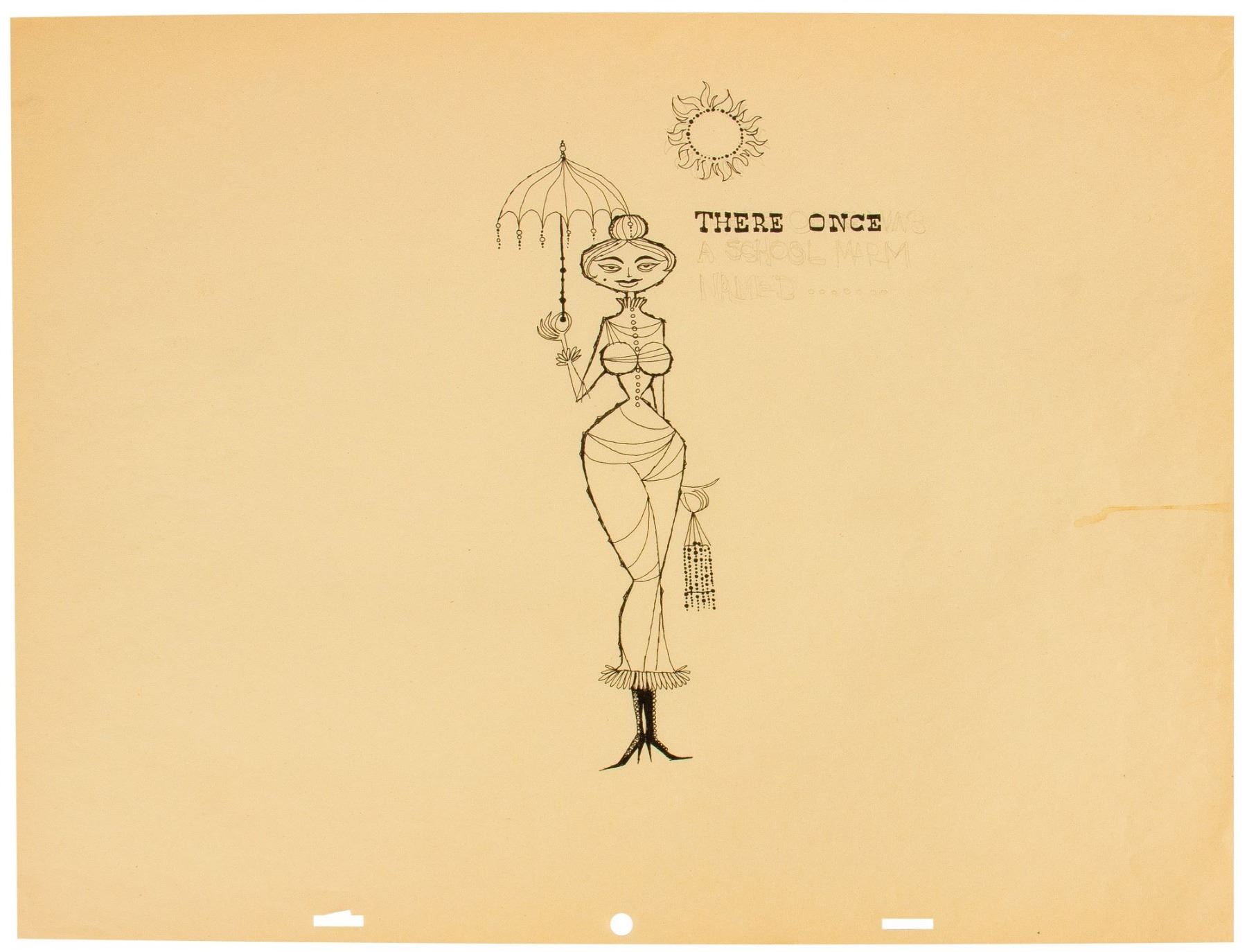 (1950s) An original illustration by Rolly Crump of "Mangy Lil". At the age of 18 while working in forestry in Idaho, one of the guys Rolly was working with told him an explicit poem about a fictitious girl named "Mangy Lil" while they worked. Rolly committed the poem to memory, and in the 1950s while at the Disney Studio, he decided to illustrate the poem. This drawing depicts the poem's title character "Lil", and begins the poem with "There once was a school marm named...". This illustration is accomplished in ink on Disney Studio animation paper and measures approximately 12.5"x15.5". The condition is very good with minor edge-wear and a small spot of discoloration on the right-edge.