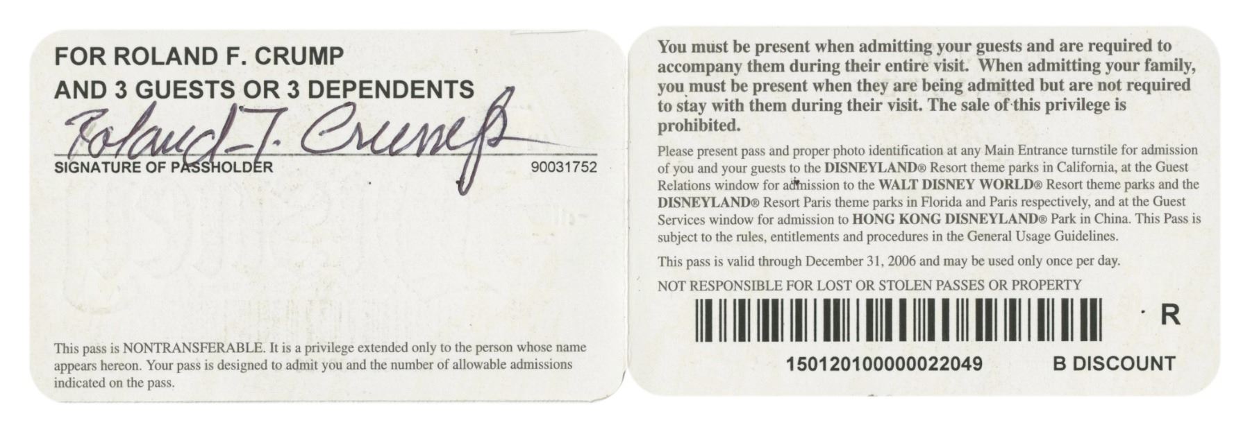(Disney, 2006) A rare Silver Pass given to Imagineer Rolly Crump for admission for him and 3 guests to Disneyland, Walt Disney World, Disneyland Paris, or Hong Kong Disneyland during 2006. The pass was given to Rolly for his work with the Disney parks, and is signed "Roland F. Crump" inside. The pass measures approximately 2.25"x3.5" closed, and is in very good condition with minor edge-wear from use.