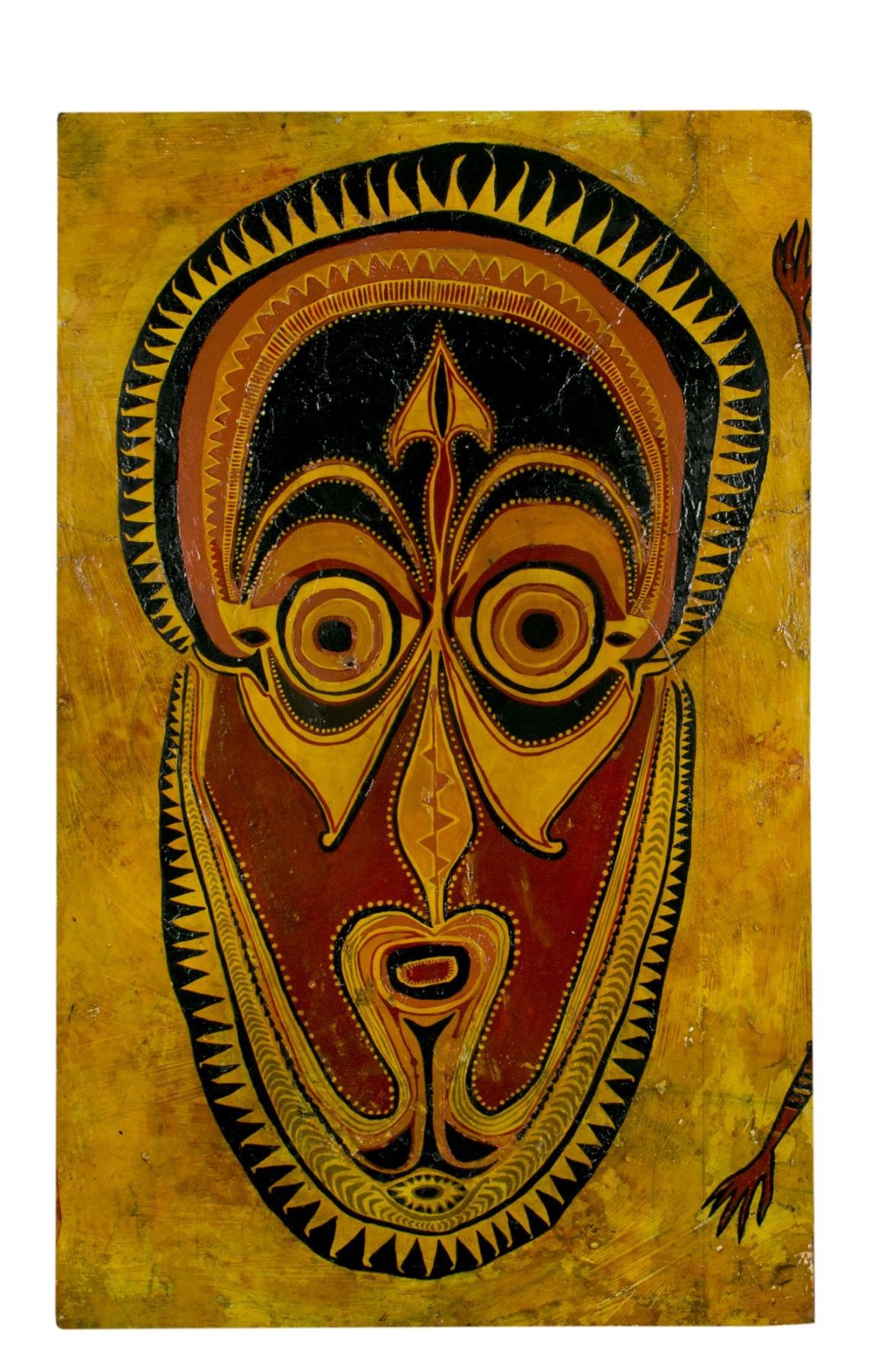 (Disneyland, c.1962) A large original painting by Rolly Crump featuring Polynesian imagery. Crump created this painting in his personal time while studying the history and art of Tiki and Polynesian culture for his work on the "Enchanted Tiki Room". Similar designs to this were later implemented in aspects of the Tiki Room, and are based on authentic Polynesian artwork. Accomplished in acrylic on wood, the painting measures 45"x27.75" and 2.25" thick. The condition is good with wear from use, including a small hole under the left eye and some thin cracks in the wood.