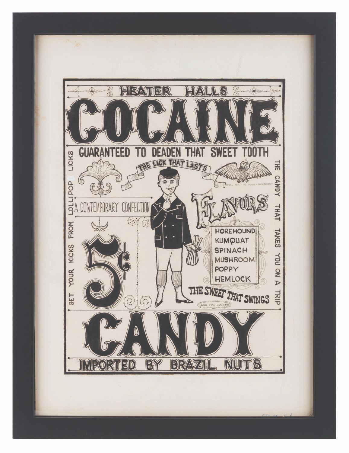 (Crump, 1957) The original illustration for Rolly Crump's popular cocaine "Doper Poster." Crump drew a “Smoke Marijuana” poster inspired by a wooden Indian, which was even displayed at a Disney Studio art show where Walt himself saw it – and to Crump’s relief, laughed. Crump created a series of five that were reproduced as posters. This original artwork is accomplished in ink on artist's board and has an image size of 19.5" x 14.5" within its 22" x 17" frame. The piece is in very good condition with light wear from age and handling.