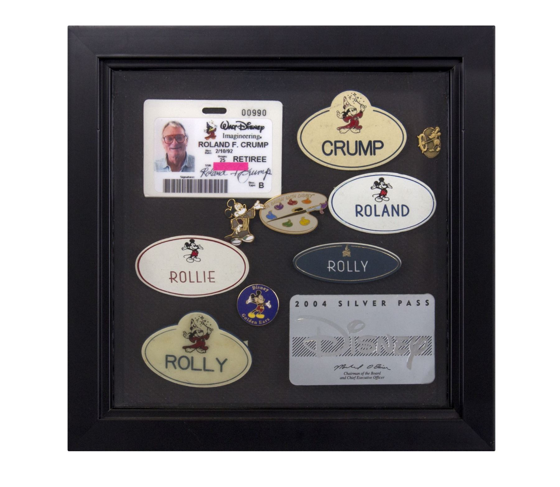 (Disneyland, c.1980s-2000s) A framed set of pins and badges which belonged to Imagineer Rolly Crump. The set includes five name badges, a silver pass for 2004, three pins, and Rolly's Imagineering Retiree identification badge from 1992. The frame measures 10"x10" and the set is in very good condition.