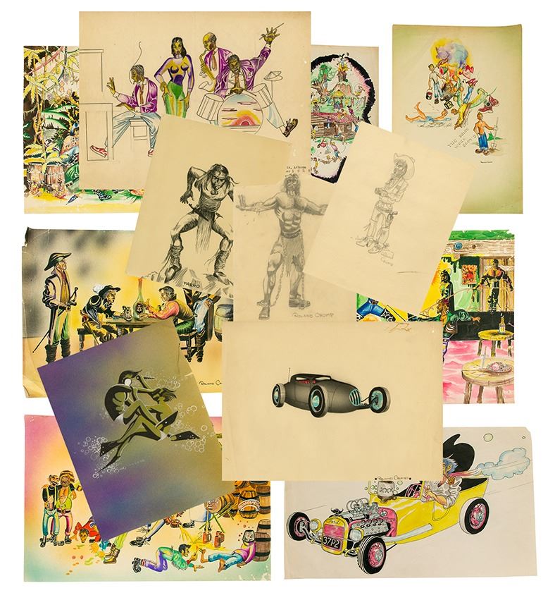 (Disney, 1952) This is the original portfolio of artwork that Rolly Crump submitted to the Disney Studio in 1952 as part of his application to the Animation Department. At the time, the only samples Rolly had of his work was his High School art portfolio, which contained various illustrations and paintings that he would describe as resembling cartoons more than fine art like other applicants would have submitted. This portfolio contains 18 samples of Rolly's artwork in a variety of media and ranging in size. Years after being hired, Rolly would be told that his portfolio was the worst portfolio ever submitted to Disney, and that they were amazed Rolly was hired at all. Evidently, they saw something in his work, as this portfolio helped launch an incredible career with the Disney Studio and the Disney Parks. This significant set of original artwork is in good condition with some expected wear from use and age. Some illustrations have edge-discoloration or wear.