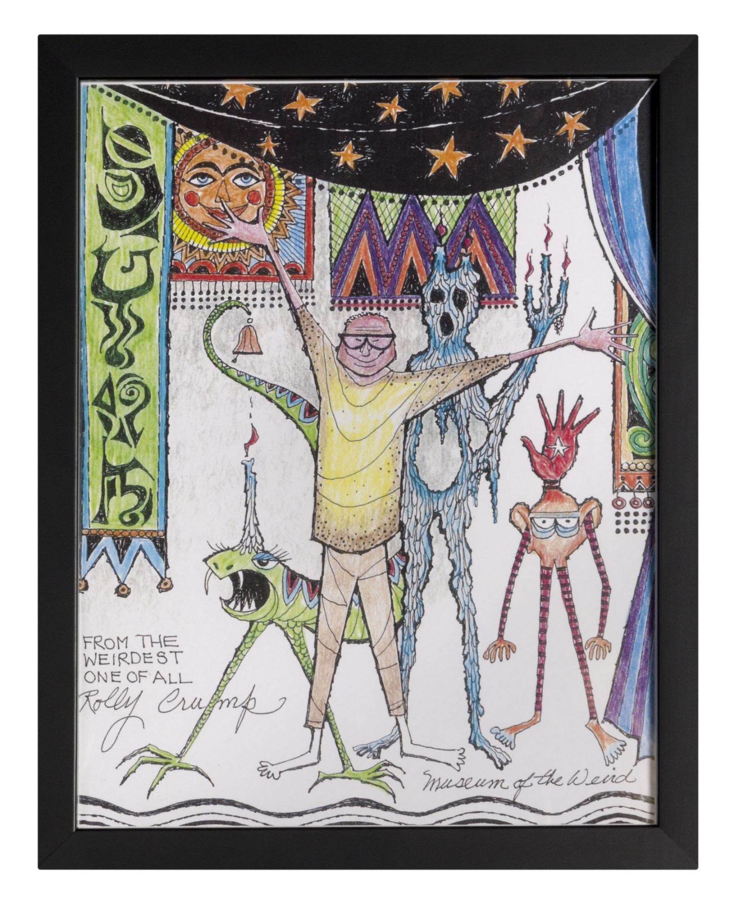 (c.1995) A colored print featuring a self-portrait of Rolly Crump with his Museum of the Weird concepts. This design was often used by Rolly when responding to fan mail, and measures 12"x9.75" framed. This print comes from the personal collection of Rolly Crump. The condition is very good with little wear.