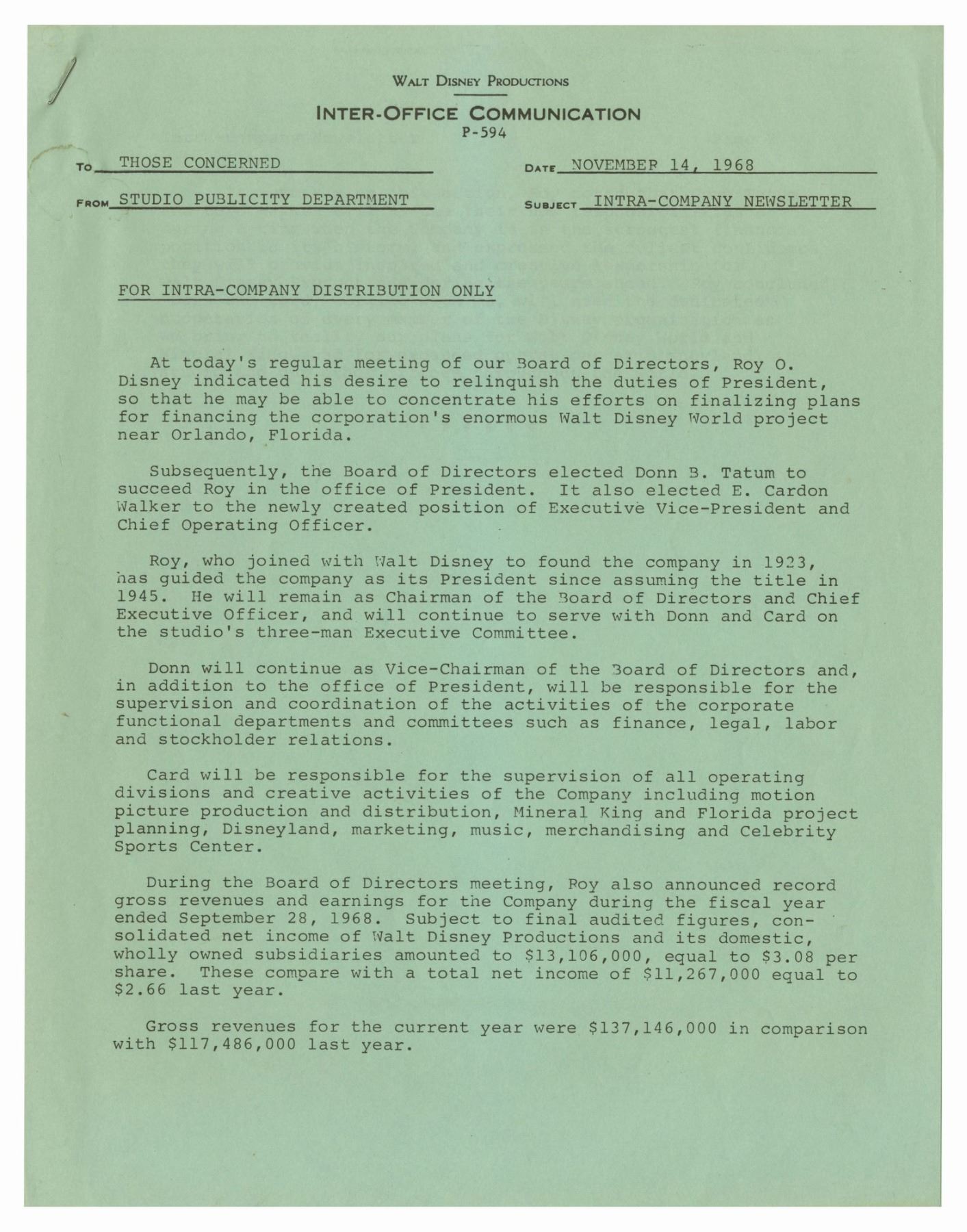 (Walt Disney World, 1968) A 2-page inter-office communication regarding the election of Donn B. Tatum to succeed Roy O. Disney as President of Walt Disney Productions in 1968. Roy Disney wished to focus his time and effort on financing Walt Disney World, as this was the strongest financial period in company history. This document is printed on 11"x8.5" green paper and is in good condition with a minor spot of discoloration in the top-left corner.