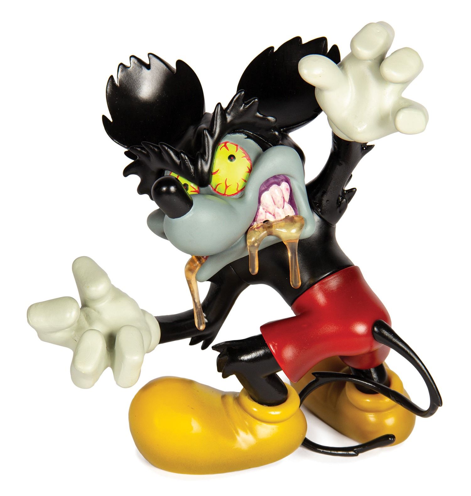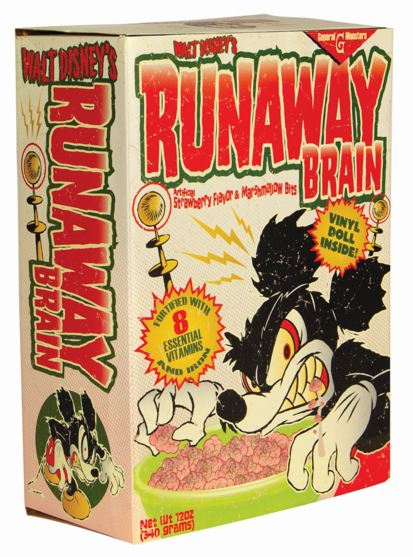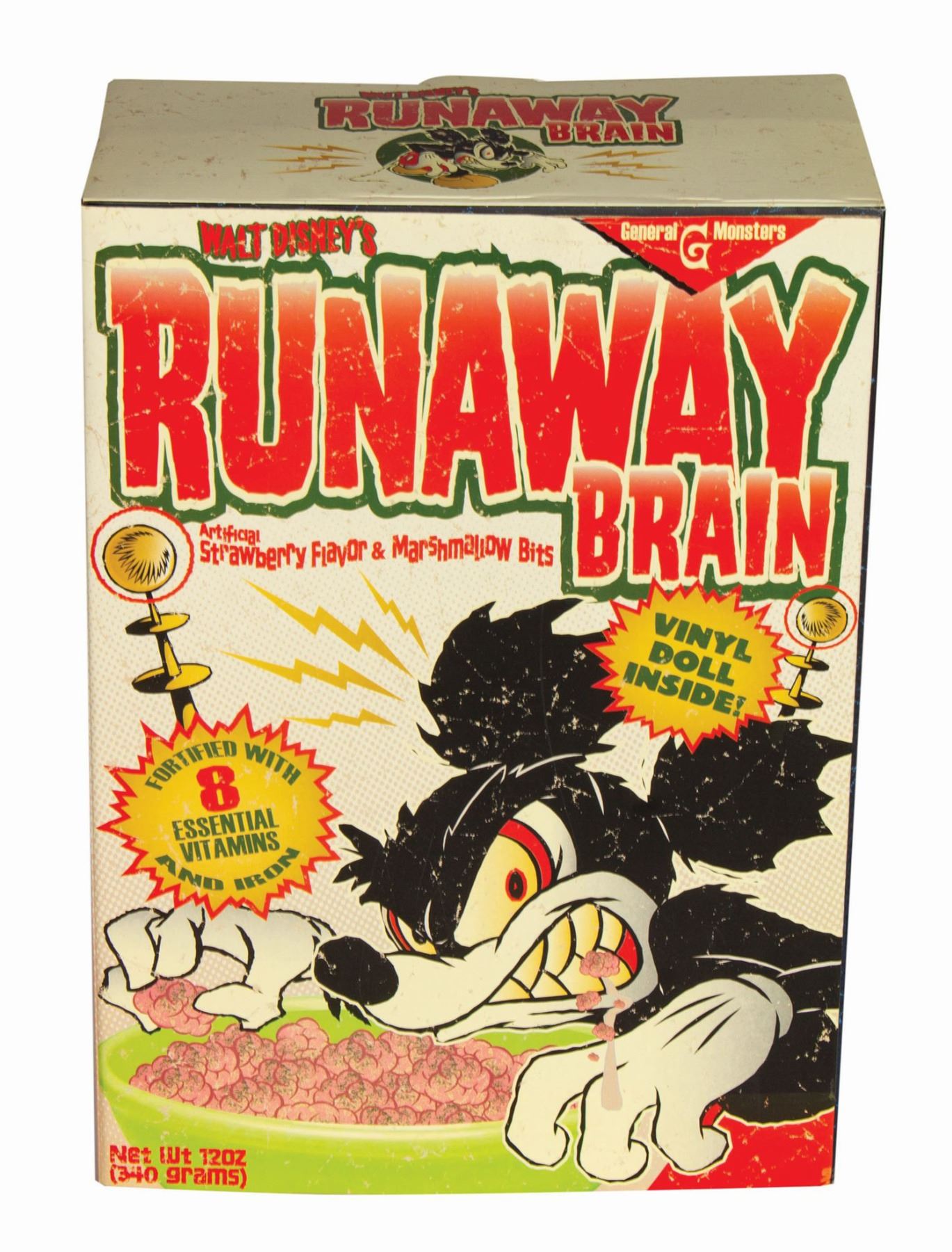 (Disney, 2006) A rare vinyl figure of Mickey Mouse from the 1995 Oscar-nominated short “Runaway Brain.” The figure comes in a faux cereal box package and was produced through a partnership between Span of Sunset Inc. and Disney. The front of the box has a hinged flap that opens to reveal the vinyl figure. Also included are a pack of Runaway Brain stickers and a t-shirt. The shirts were included in random sizes and imagery, with this particular shirt being a white size XL. The figure is the "original" color variant of the four types offered. The stylish box measures 16"x11.75" and 6.25" deep while the vinyl figure measures 8" tall. The figure is in very fine condition, and the box has some shelf wear including some creases around the box lid and edges.