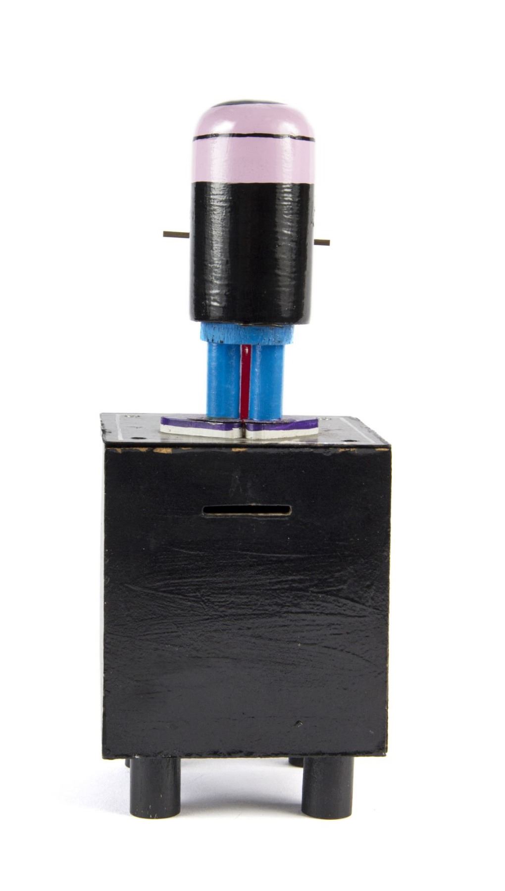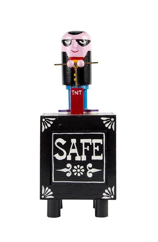 (1960s) An original one-of-a-kind "push-down" bank toy created and hand-painted by Rolly Crump. This bank was designed that when the safe cracker is pushed down, a sign reads "Boom" and the safe would open and the coins inside would spill out. This bank measures 10.5" tall and is in good condition with some expected wear from age and minor repairs made by Rolly. The mechanisms which open the side panel do not currently function.
