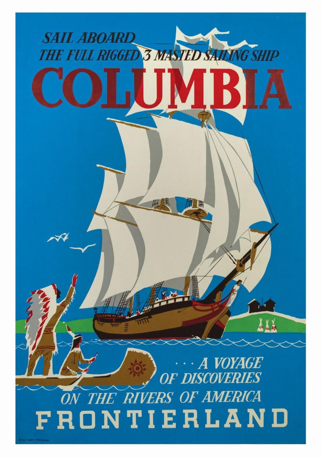 (Disneyland, 1958) A hand-silkscreened attraction poster for the Sailing Ship Columbia. Designed by Bjorn Aronson, this poster captures the feeling of the original Frontierland with stunning colors and imagery. The poster measures 54"x36" and presents in very good condition. There is some edge-wear, including a couple of small tears and minor chipping, and an 11" crease at the upper right corner. The reverse has some abrasions to the paper on the top and bottom edge, but they do not affect the image. The sails show some spots of blue ink, likely done during the silkscreen process, but the color throughout is vibrant and displays beautifully.