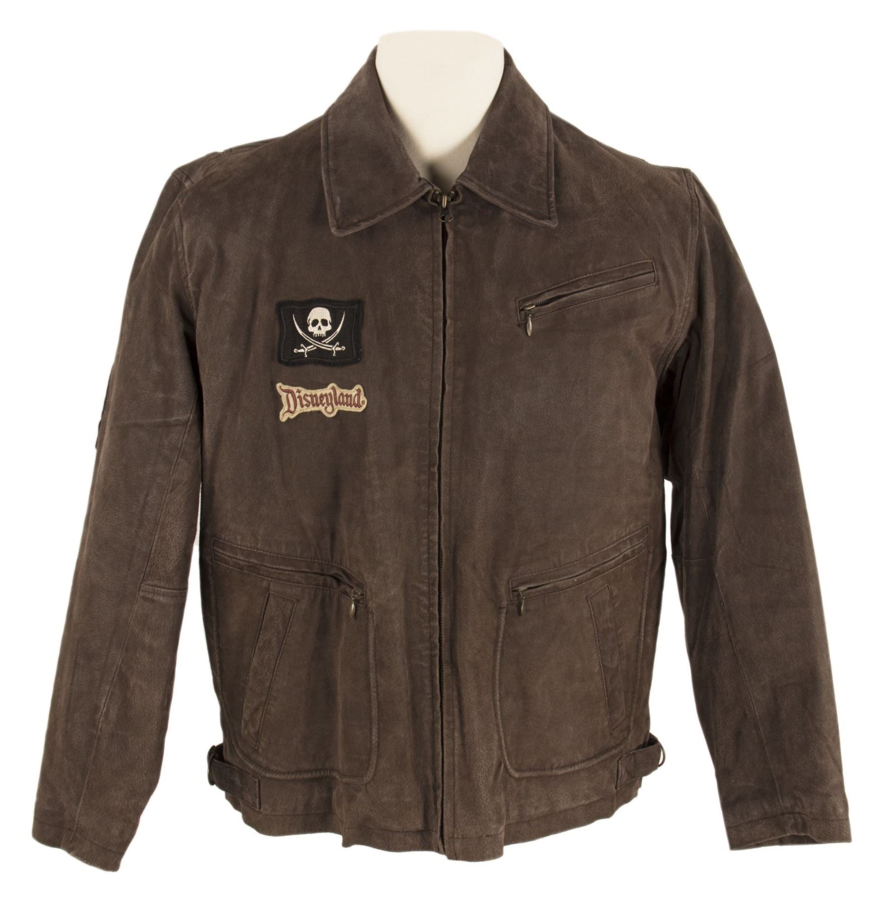 (Disneyland, 2003) A rare leather jacket and baseball cap from the July 9, 2003 event at Disneyland celebrating the premiere of Pirates of the Caribbean: Curse of the Black Pearl. The jacket features embroidered patches on the front right and on both arms, including one which bears the iconic "Dead Men Tell No Tales." The back of the jacket is printed with a large version of the logo for the event, while the hat is embroidered with a Pirates of the Caribbean logo. Both items come from the estate of Imagineer Sam McKim. The jacket is a size M, and both the hat and jacket are in very good condition with minor wear.