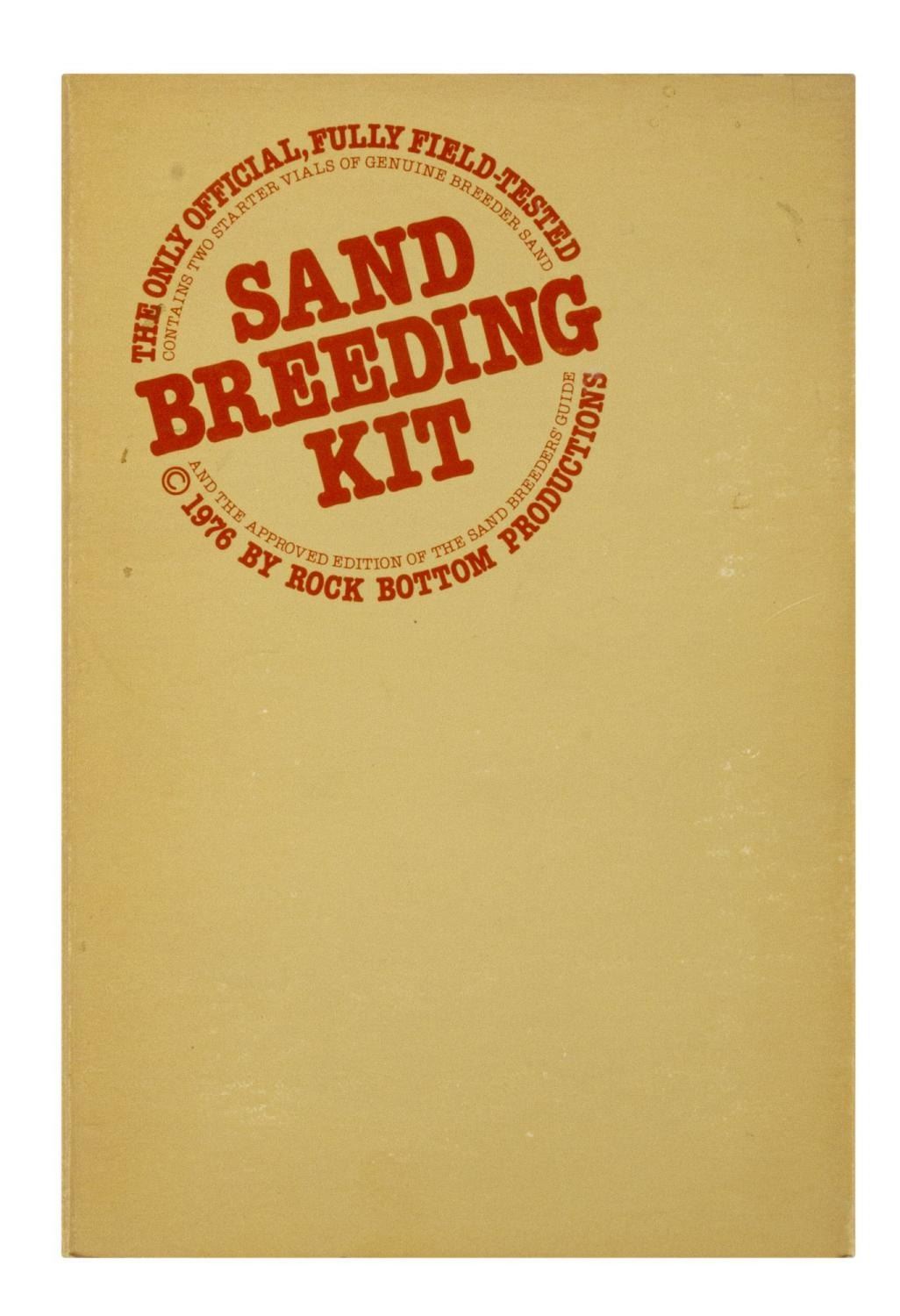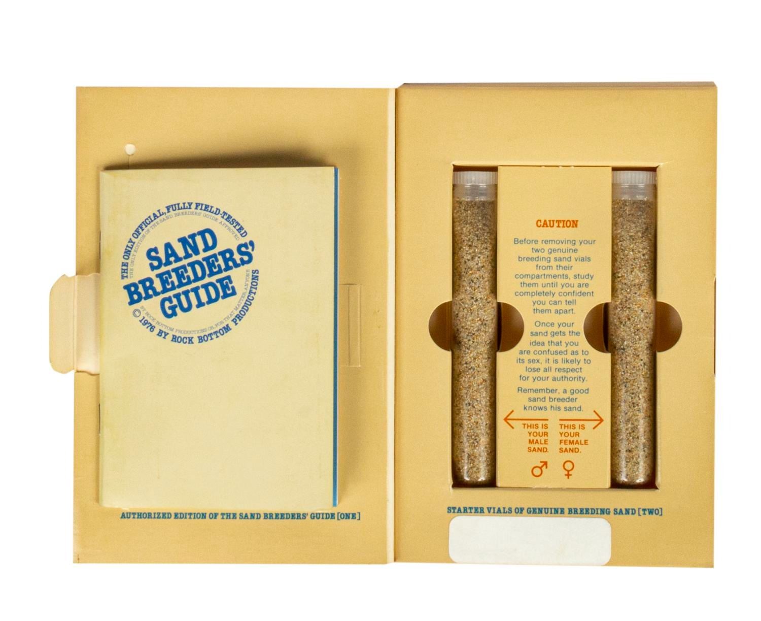 (Gary Dahl, 1976) A very rare "Sand Breeding Kit" that was created by Gary Dahl, the creative mind behind the Pet Rock. This boxed "Sand Breeding Kit" is a humorous follow-up to Dahl's Pet Rocks, and the kit is unused in its original box. The kit includes an instructional sheet, and two tubes of Male and Female sand for breeding. The box measures 7.75"x5" and 1" thick, and the condition is very good with some surface and edge wear to the box.