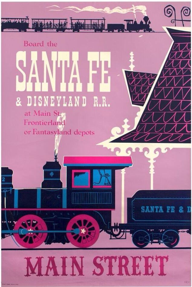 (Disneyland, 1956) A rare original hand silk-screened poster for the "Santa Fe and Disneyland Railroad" attraction at Disneyland. This Bjorn Aronson designed poster features charming Main Street imagery and lists depots at Main Street, Frontierland, and Fantasyland. This item measures approximately 54"x36" and is in good condition with minor edge-wear and some spots of creasing.