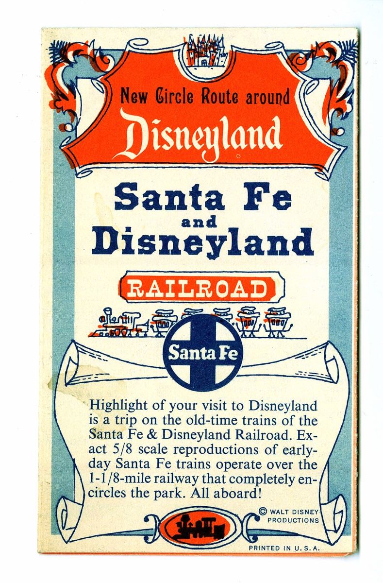(Disneyland, 1957) Fold-out pamphlet containing a small early park map inside and information on the Railroad. Measures 5"x3" folded. In good condition with some edge and fold-wear.