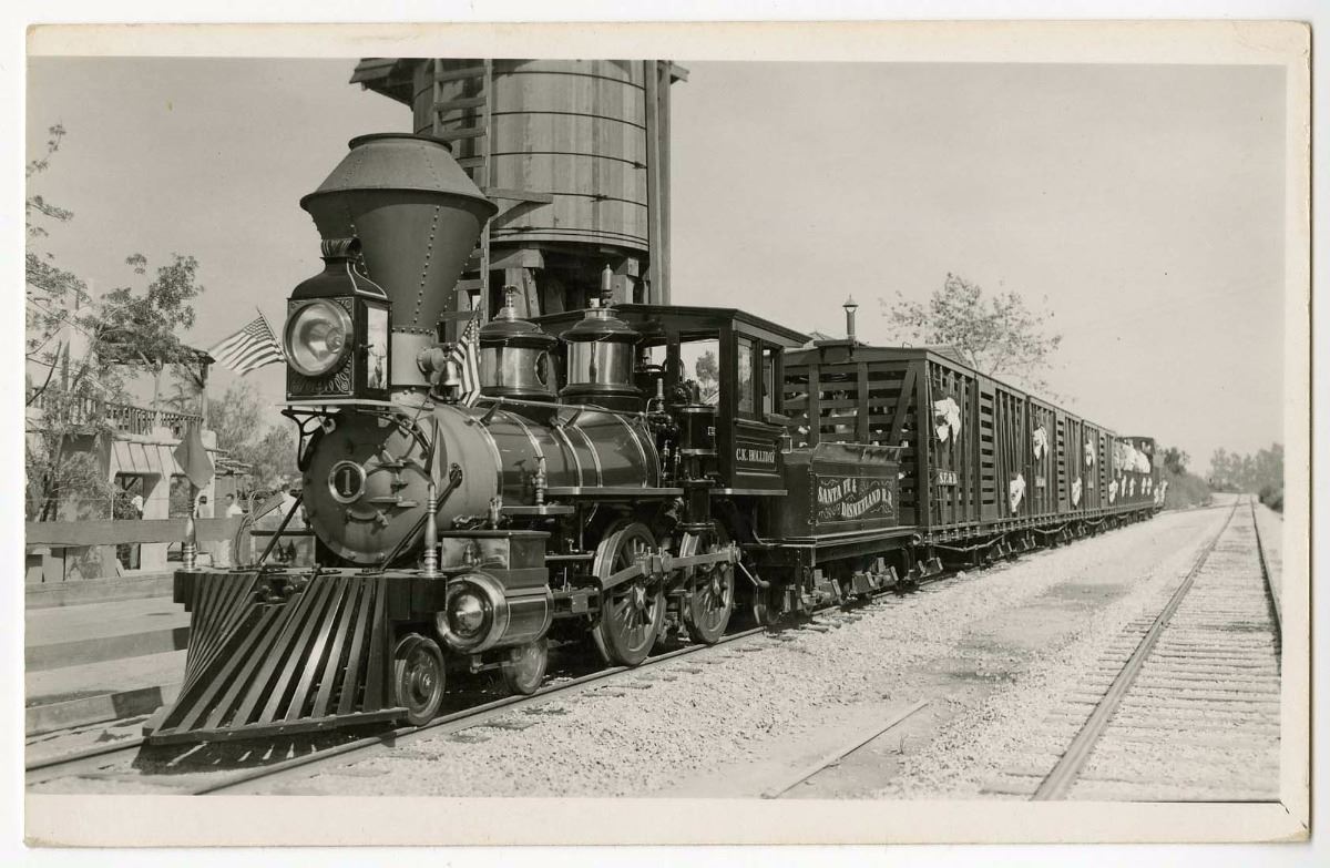 (Disneyland, 1955) Opening day postcard of the Santa Fe & Disneyland Railroad at Frontierland Station. Writing in blue ink on the back of the card notes the opening day and is dated 7/17/1955. Measures 3.5"x5.5" and is in good condition.