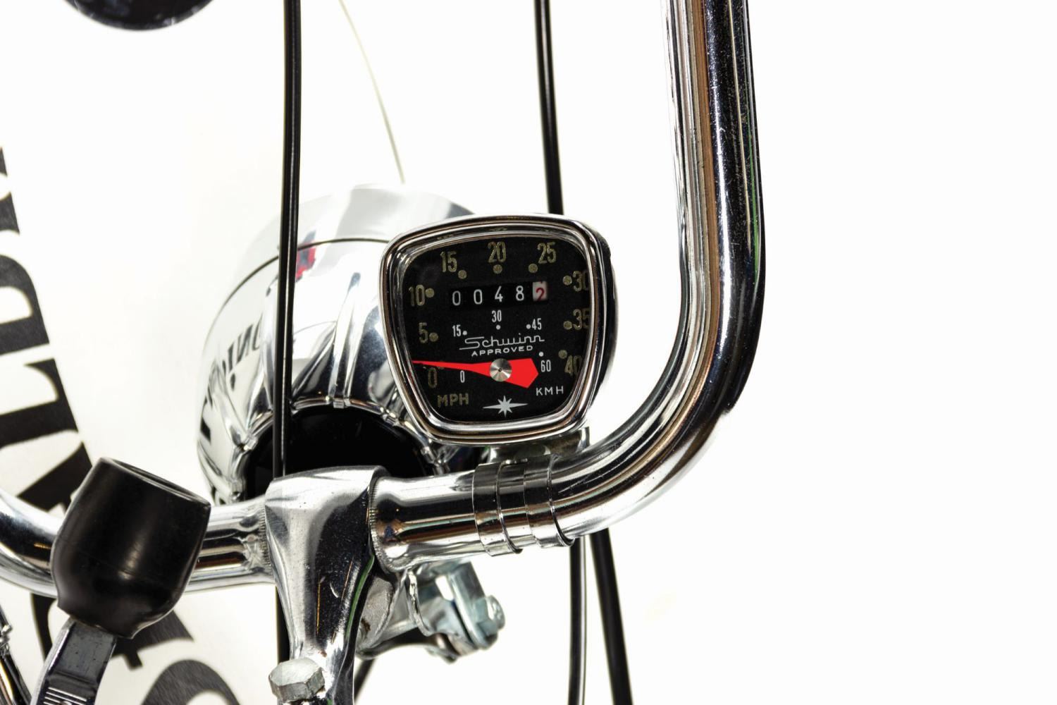 (Schwinn, 1970) A vintage Sting-Ray Cotton Picker bicycle manufactured by Schwinn. The "Diamond Jubilee Model," the Cotton Picker was created in 1970 to celebrate Schwinn's 75th anniversary in the bike business. Serial number MF117938, the bicycle features all the hallmarks of the iconic "Krate" series of Sting-Rays, such as a banana seat with metal Sting-Ray plate and sprung sissy bar; ape hanger handlebars with molded grips, two-tone streamers, and dual hand break levers; sprung front fork; chrome front and back fenders; branded chain guard; five on the frame stick shifter; front and back drum breaks; kickstand; 20"x2.125" white striped back tire; and 16"x1.75 white striped front tire. Accessories include a rearview mirror with checkerboard backing, speedometer/odometer, a front light, a squeeze horn, a tennis racket holder on the front fork, a baseball bat holder on the back fork, plastic noisemaker card clipped in the front spokes, "Cotton" Alabama 1970 rear license plate, and an under-the-seat Schwinn-branded Sabra leather pouch containing a tire patch kit and 10-piece bike tool set. The bike retains vintage Schwinn Service warranty and Schwinn Super-Service Used Bike hang tags. It is accompanied by a 33" long wooden baseball bat painted white with black Schwinn Sting-Ray Cotton Picker branding; a Spalding Kro-Bat tennis racket, measuring 27" long and 9" wide, with white and black leather Spaulding cover embellished with a metallic Schwinn decal; and a black and white embroidered Schwinn triple stripe adjustable baseball cap with rear Sting-Ray plate. Measuring 43" tall, 53" long, and 27.5" wide, the bike is in very fine condition, stunningly restored to its like-new glory. The handlebar grips have yellowed slightly, there's minor peeling to the decals on the gear shift, some paint wear, weathering, and age. There is wear and surface loss to the leather wrap on the tennis racket handle, a chip in the baseball bat barrel that has been painted over, and the hang tags exhibit age and handling. This item may require special shipping arrangements, please inquire for details and estimates.