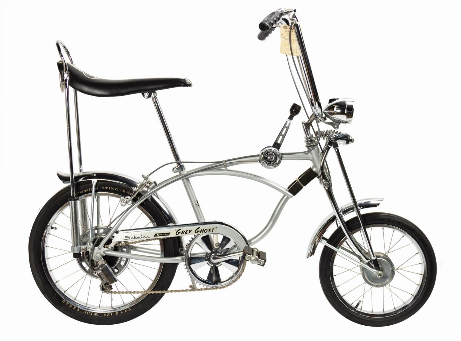 (Schwinn, 1971) A vintage Sting-Ray Grey Ghost manufactured by Schwinn. Serial number HG082650, this Grey Ghost is from 1971, the first year the model was offered. The bicycle features all the hallmarks of the iconic "Krate" series of Sting-Rays, such as a banana seat with metal Sting-Ray plate and sprung sissy bar; ape hanger handlebars with molded grips and dual hand break levers; sprung front fork; chrome front and back fenders; branded chain guard; five on the frame stick shifter; front drum break; kickstand; 20"x2.125" wide tread back tire; and 16"x1.75 front tire. Accessories include a fold-out metal passenger step on the rear hub and a handlebar bike light. The bike retains a vintage Scwhinn hang tag and suggested retail price tag. Measuring 43" tall, 53" long, and 26" tall, the Grey Ghost is in very fine condition with minor wear from age. The bicycle is new old stock straight from a dealer's showroom floor. This item may require special shipping arrangements, please inquire for details and estimates.