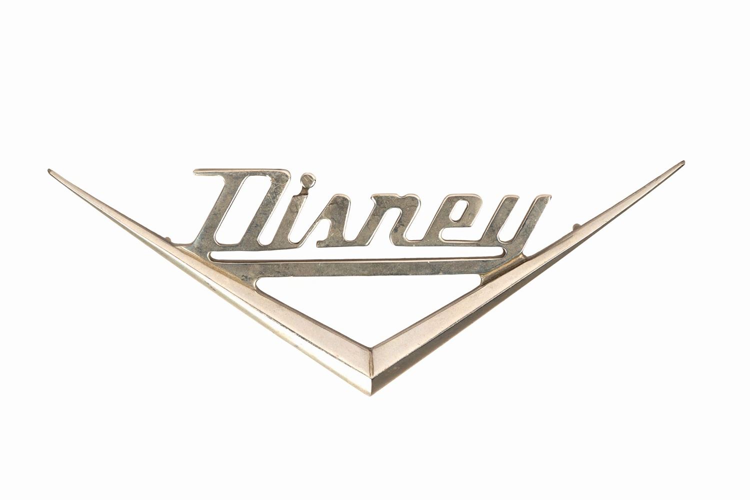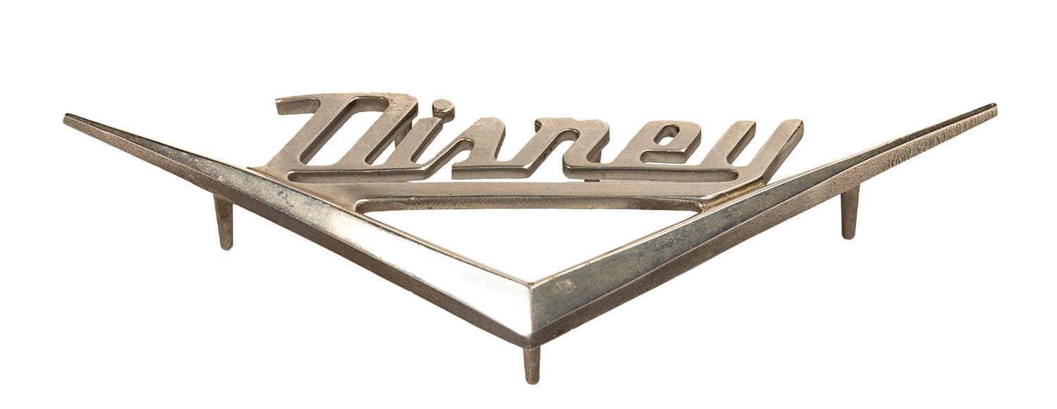 (Disney-MGM, c.1991) A Disney hood ornament from the Sci-Fi Dine-In Theater Restaurant. This hood ornament reads "Disney" and is from one of the restaurant's familiar car tables. The ornament measures 3.5"x7.5" and is in good condition with minor surface wear from use.