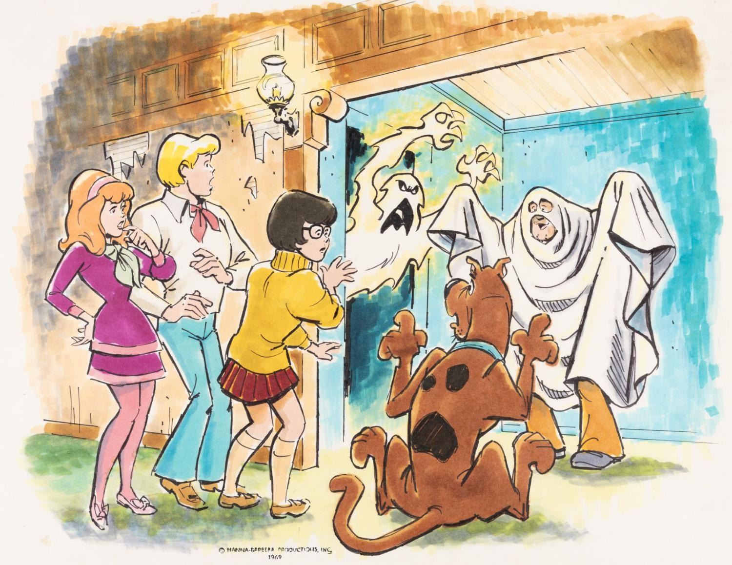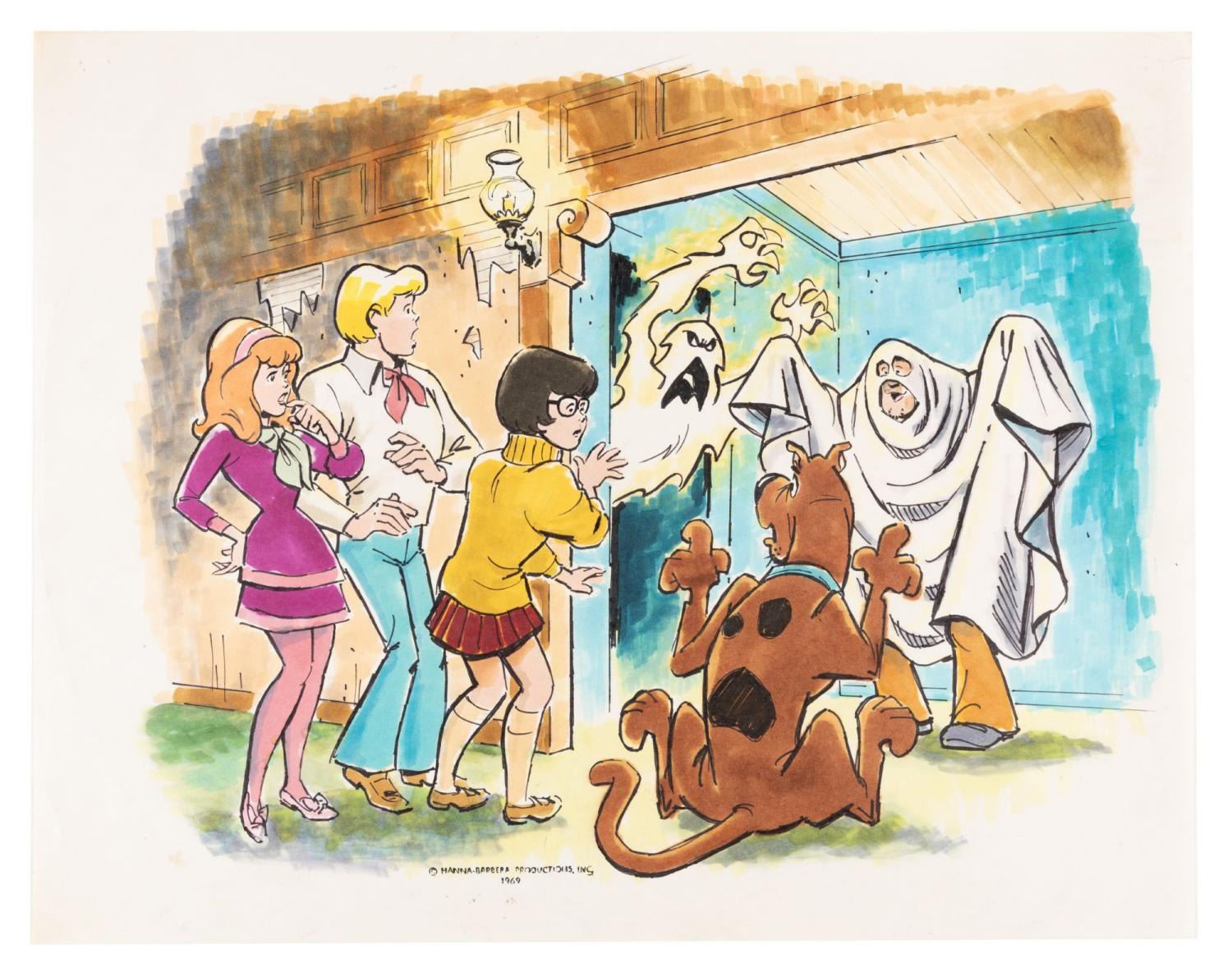 (Hanna-Barbera, 1969) Original artwork of the Scooby Gang from “Scooby-Doo, Where Are You!” by character designer Iwao Takamoto. Accomplished in ink and marker on 13” x 16.5” animation paper, the artwork is in very good condition with pinholes to the top corners from studio use and display.