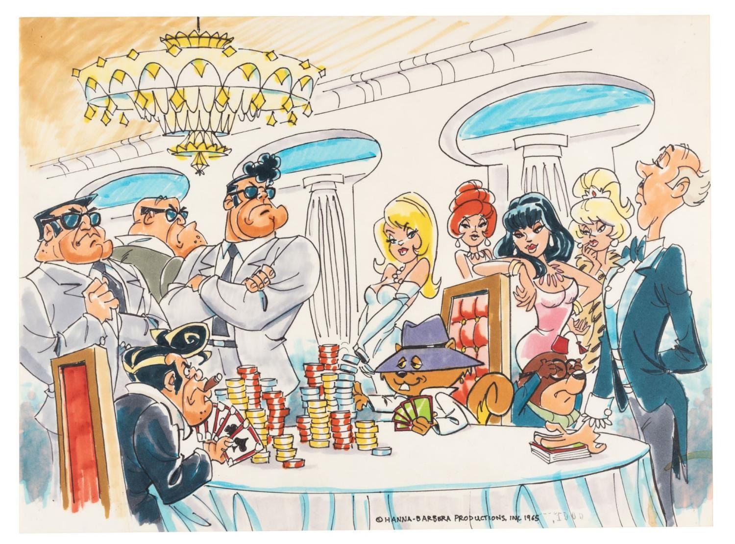 (Hanna-Barbera, 1965) Presentation artwork of Secret Squirrel from "The Atom Ant/Secret Squirrel Show," by animator Iwao Takamoto. Accomplished in ink and marker on 11.5" x 15.5" animation paper, the artwork is in very good condition with pinholes in the corners from display.