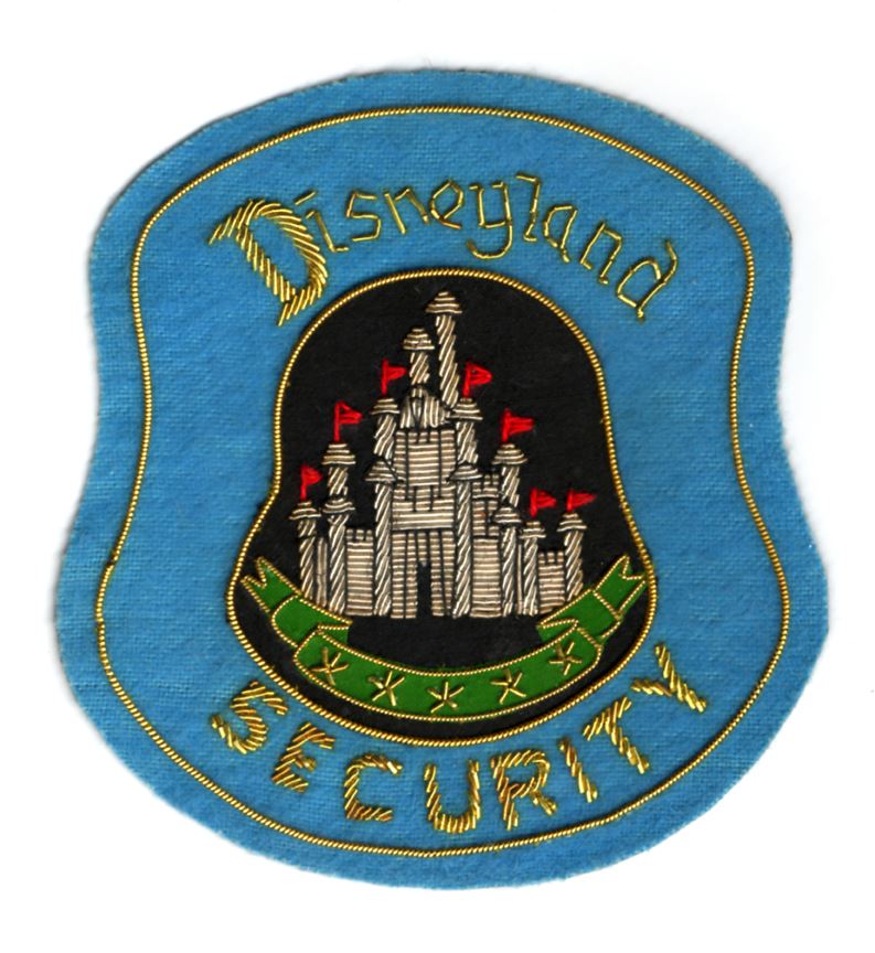 (Disneyland, 1958) Embroidered jacket patch for a high-raking Disneyland Security officer, dating from the late 1950s to the early 1960s. This felt and bullion stitched design was used on ceremonial dress uniforms, a step above the general use jacket patch. Unissued, measuring 4.25 x 4 in. and in fine condition.