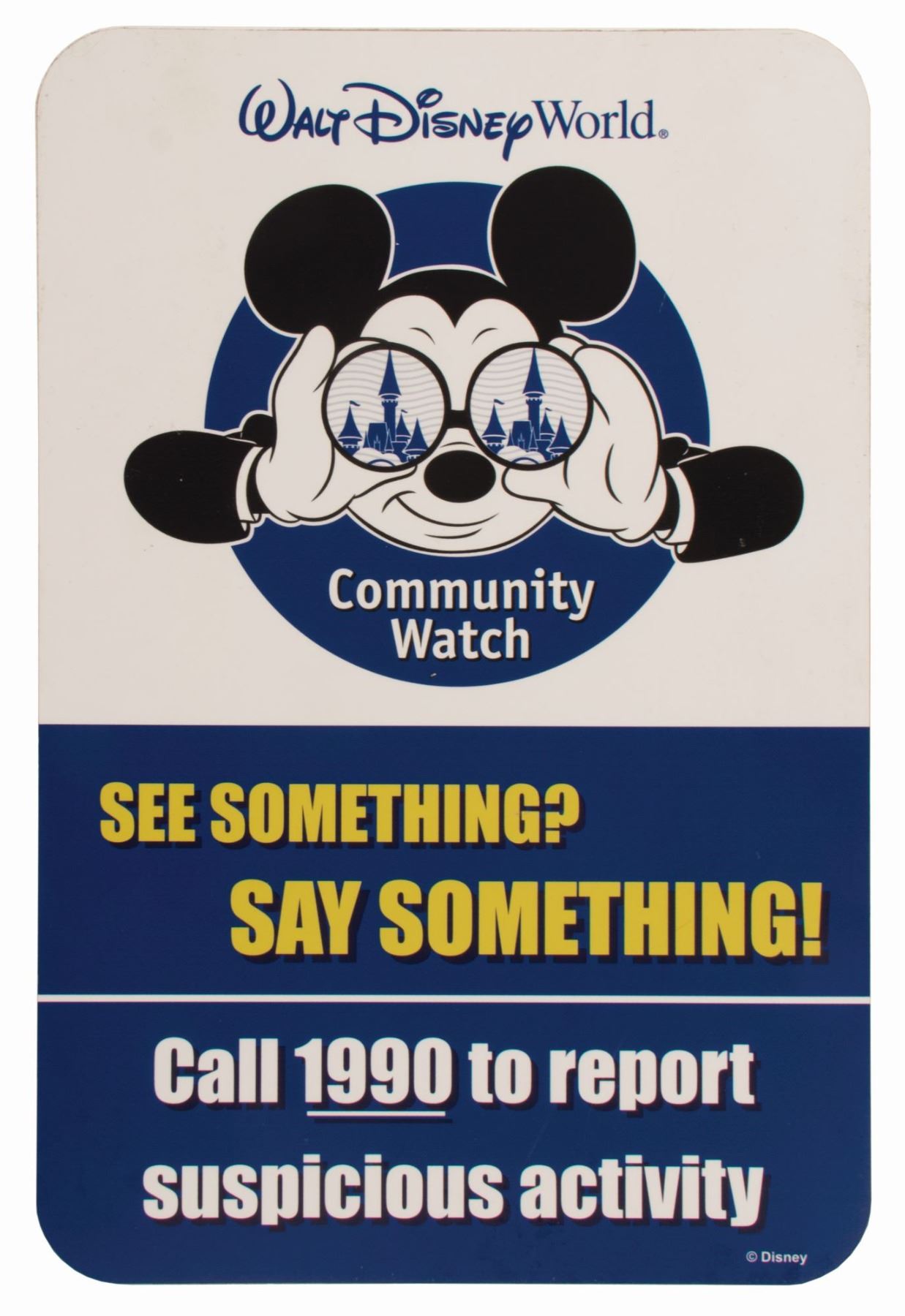 (Walt Disney World, 2000s) A rare Community Watch sign that was displayed at Walt Disney World. This sign features an image of Mickey looking through binoculars with the iconic safety-themed slogan, "See Something? Say Something!" The sign is printed on acrylic board, measuring 18"x12" and is in good condition with some residue and surface wear from display.