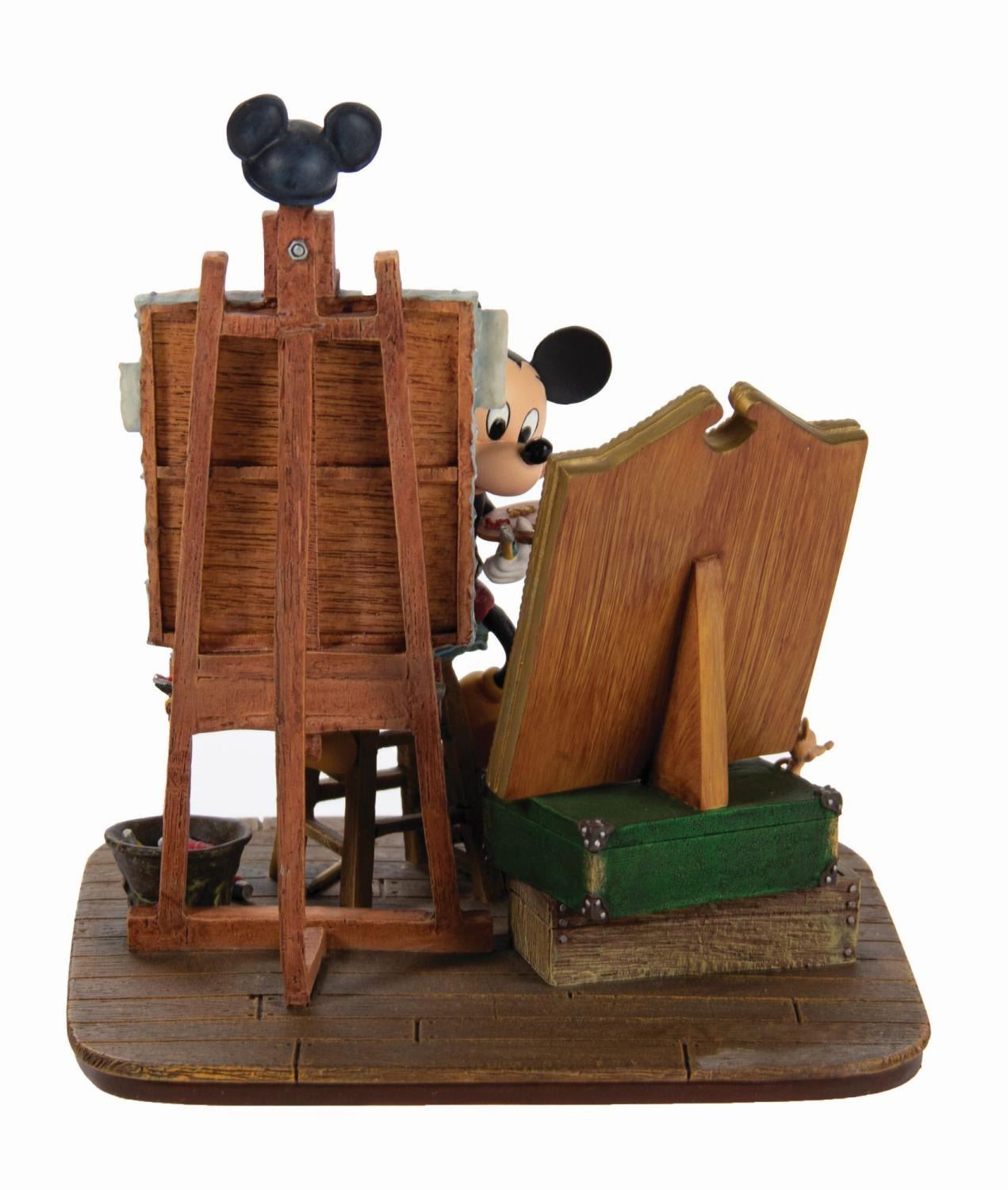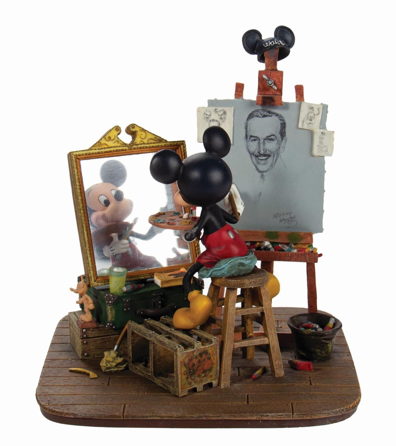 (Disneyland, c. 2010s) A figurine based on artist's Charles Boyer's original painting, Self-Portrait Mickey Mouse. Constructed of cast resin, the intricately sculpted figure features Mickey Mouse sitting at an easel, looking into a real mirror, as he paints a portrait of his creator, Walt Disney. Originally inspired by Norman Rockwell's famous painting, the figure highlights the inextricable link between Walt Disney and all the characters, artwork, and theme parks created under his charge. Measuring 7.25"x6.75" and 6.5" deep, the piece is in fine condition with minimal wear. The original 9.75"x8.75" and 8.75 deep box is included.