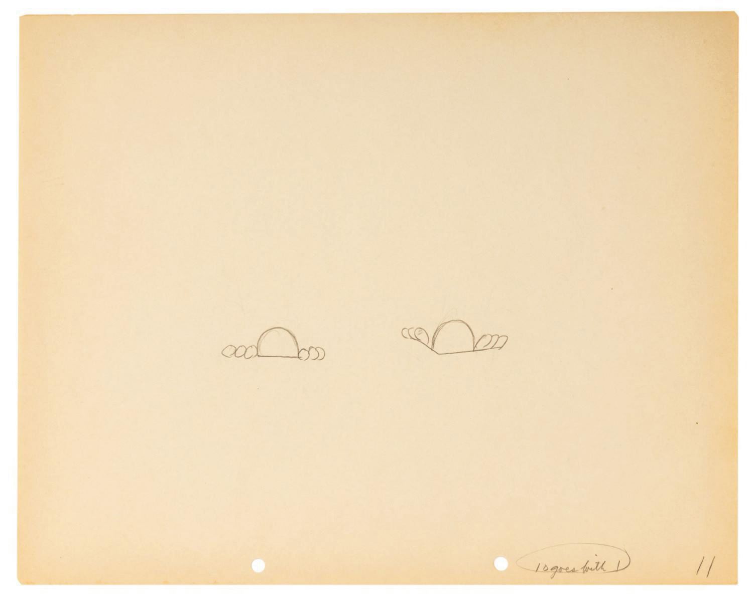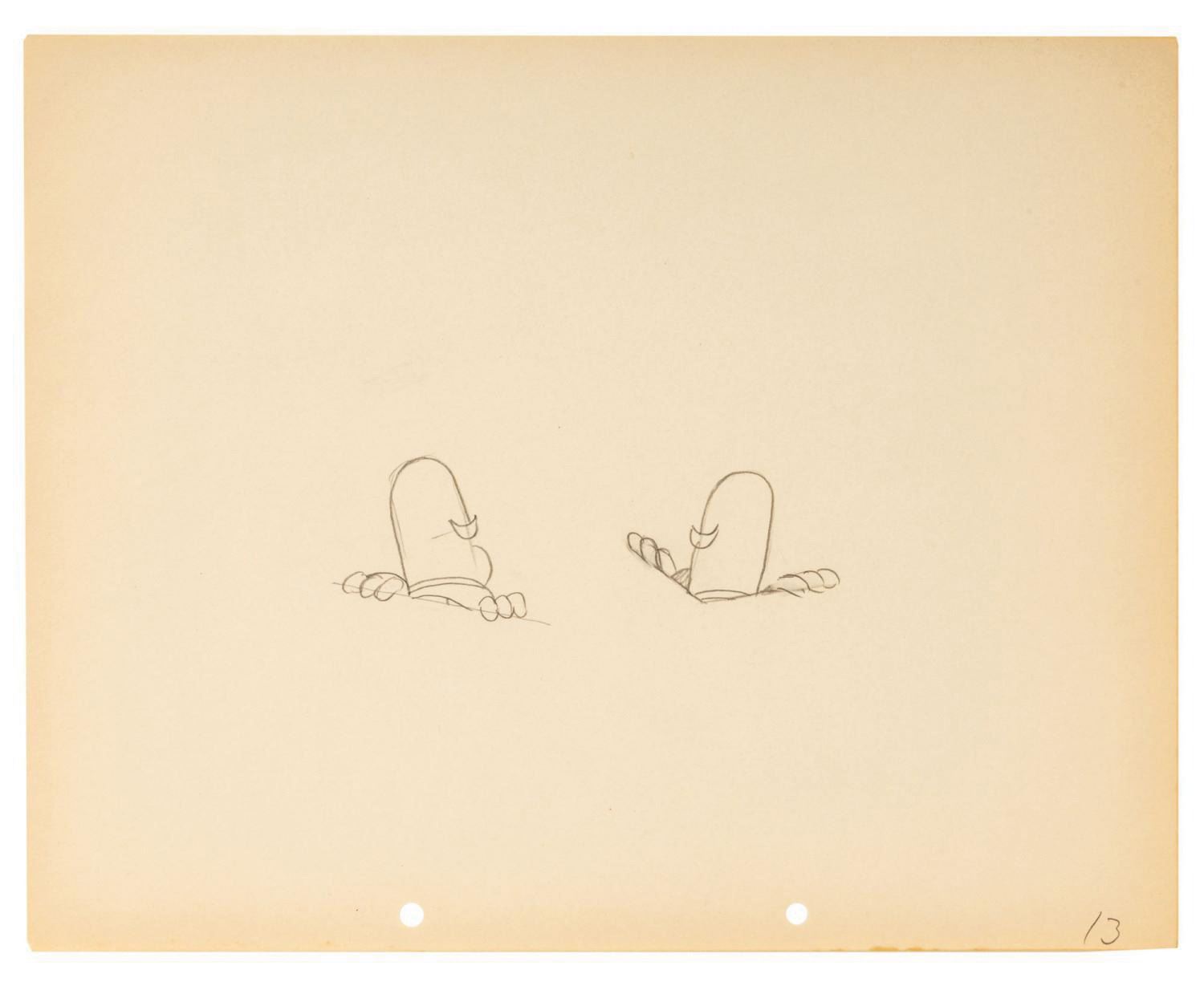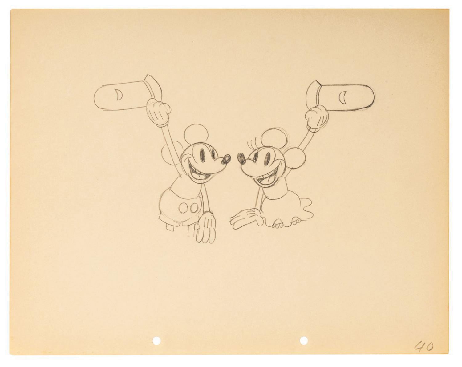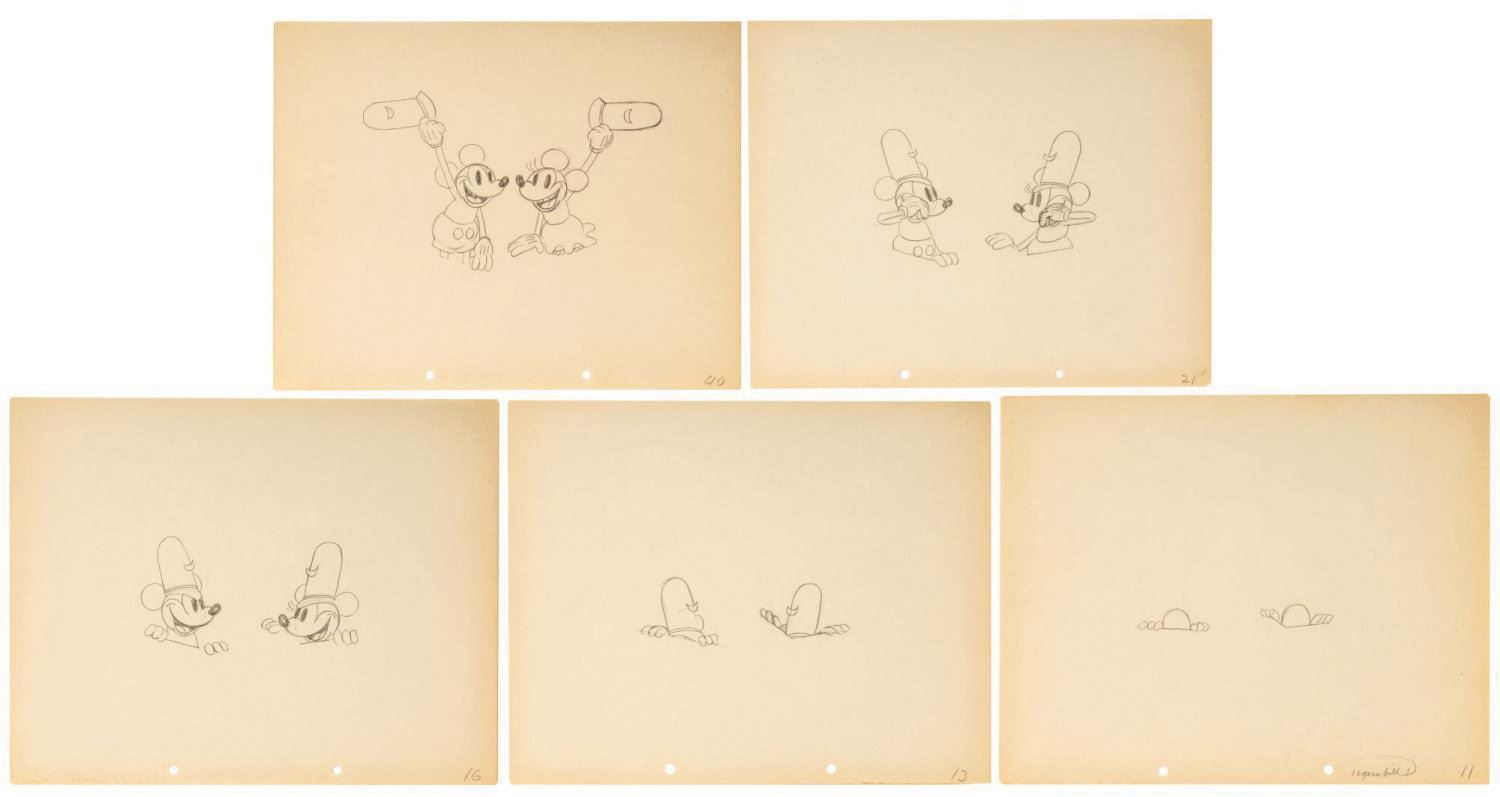 (Disney, 1932) A sequence of (5) production drawings from the ending moments of "The Whoopee Party" starring Mickey and Minnie. After Mickey and Minnie host a boisterous party with all their friends, the local lawmen respond, only to join in themselves. To end the short, Mickey and Minnie perform a showstopping duet atop a table and raise a pair of constable hats. The pieces have image sizes ranging from 3.5"x5.5" to 4.75"x7.75" on their 9.5"x12" animation paper. Each piece displays in very good condition, exhibiting minor color toning and handling wear.
