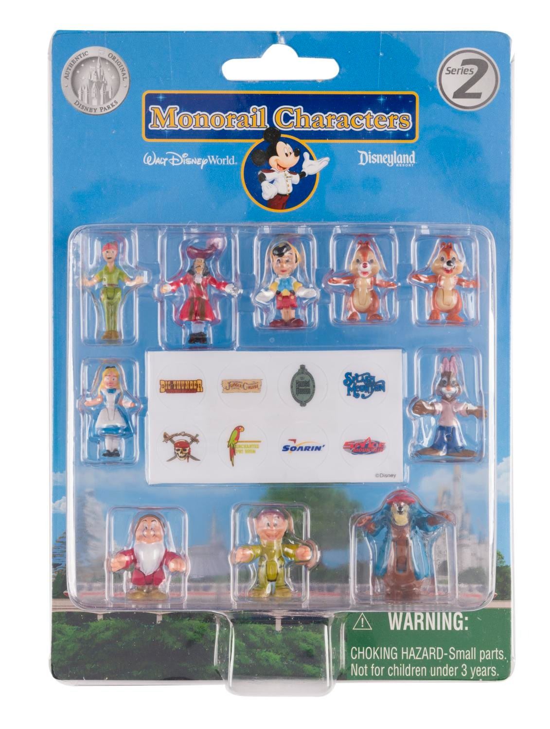 (Disneyland/Walt Disney World, 2000s) A Monorail Characters Series 2 Set including miniature articulated figures of Peter Pan, Captain Hook, Pinocchio, Chip, Dale, Alice, Br'er Rabbit, Grumpy, Dopey, and Br'er Bear with attraction decal accents. The figures and package are in fine condition.