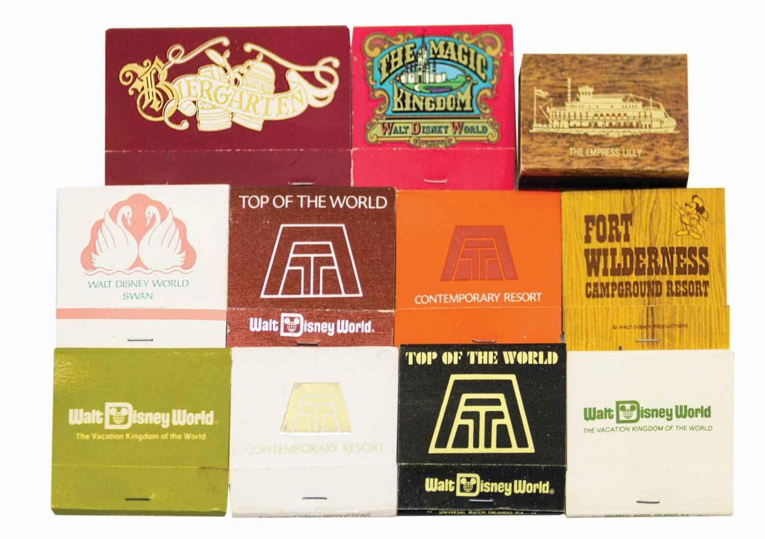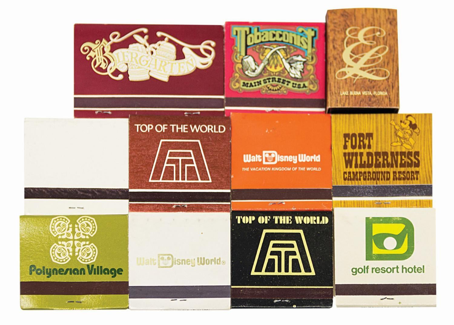 (Walt Disney World, c.1980s-90) A set of (11) rare matchbooks from various hotels and restaurants in the Walt Disney World resort. The collection includes (1) Main Street U.S.A. Tobacconist from the Magic Kingdom, (1) Biergarten from the Germany section of the Epcot World Showcase, (1) Fort Wilderness Campground, (1) Polynesian Village Resort, (1) Walt Disney World Swan Hotel, (1) Disney Golf Resort Hotel, (3) different styles of book from the Contemporary Resort, and (1) Empress Lilly matchbox. All are complete and unused. Ranging in size from 2"x2" to 3"x2", the pieces are in generally very good condition with minor edge wear, surface impressions, and handling.