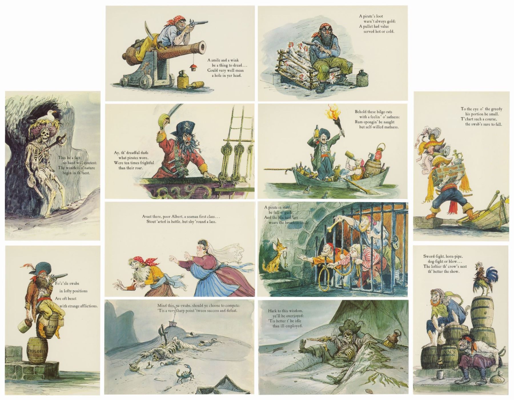 (Disneyland, c.1966) A complete set of (12) souvenir postcards based on the Pirates of the Caribbean attraction. These cards feature concept artwork by Imagineer Marc Davis, and this set includes all (12) cards from Disneyland which complete both the "A" and "B" sets of cards. The cards measure 3.5"x5.5" each, and the set is in very good condition with minimal wear.