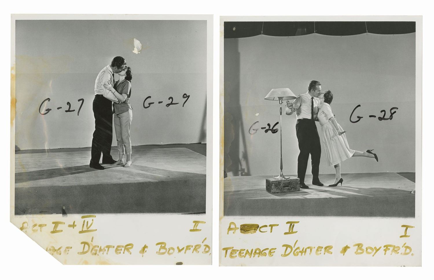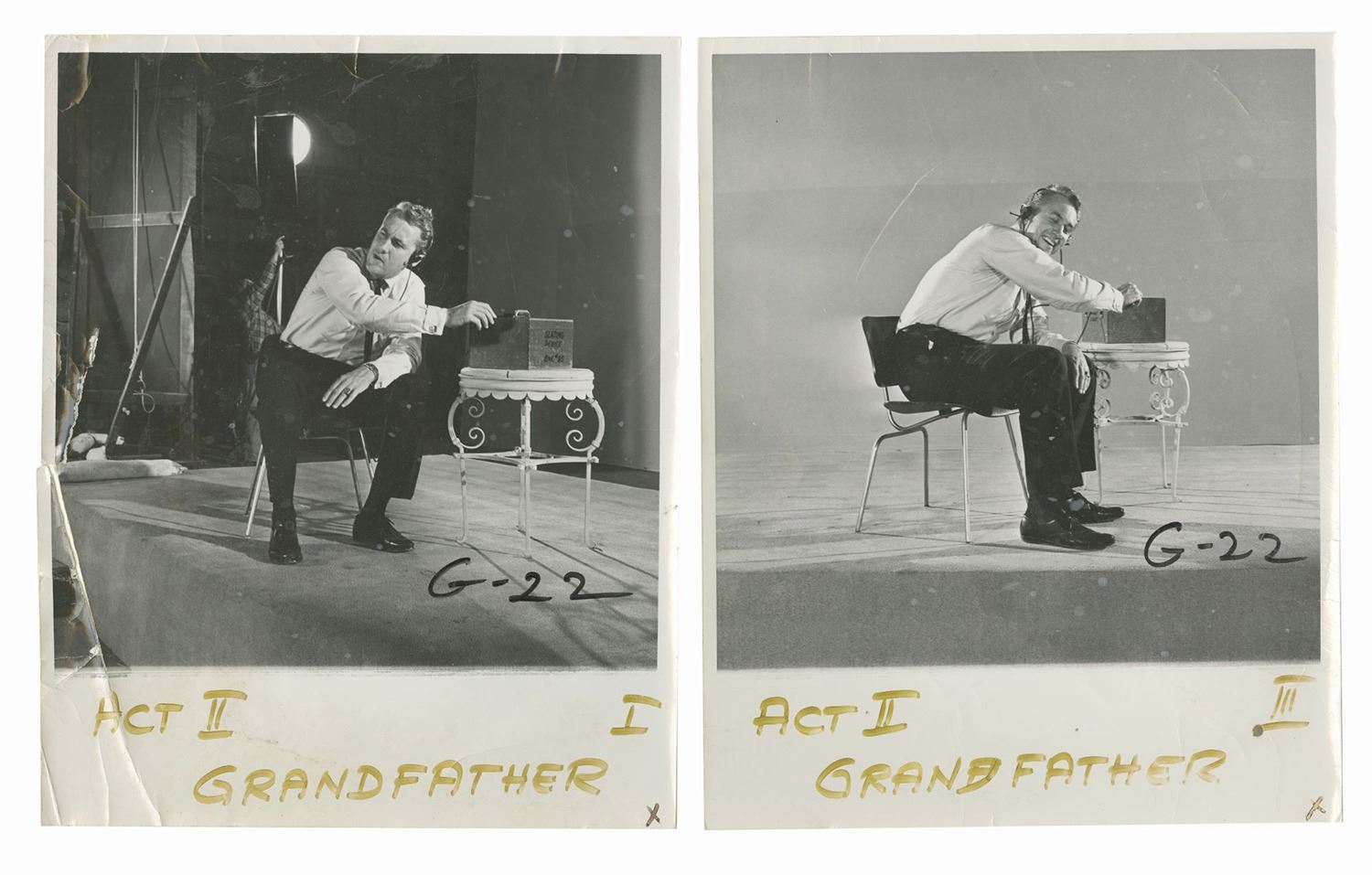 (World's Fair/Disneyland, c.1963) An incredibly rare set of (13) black and white Imagineering reference photos used in the creation of Walt Disney's Carousel of Progress. To help determine the proper lighting and positioning of the animatronic characters, live actors were used and photographed as reference. These photos were taken in 1963 for the original version seen at the 1964-65 New York World's Fair. Following the World's Fair, the attraction was moved to Disneyland, and later to Walt Disney World. These photos provide a fascinating look into this iconic attraction, and depict several live actors standing in place for the animatronics seen in the 1920s Second Act. Each photo measures approximately 10"x8" and the condition is fair with some handling wear, creases, small tears, and areas of discoloration from use. Many of the photos have original pencil reference numbers written on the reverse.