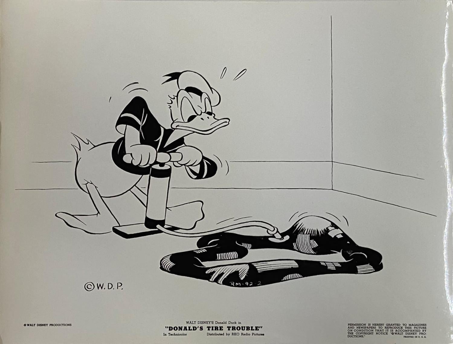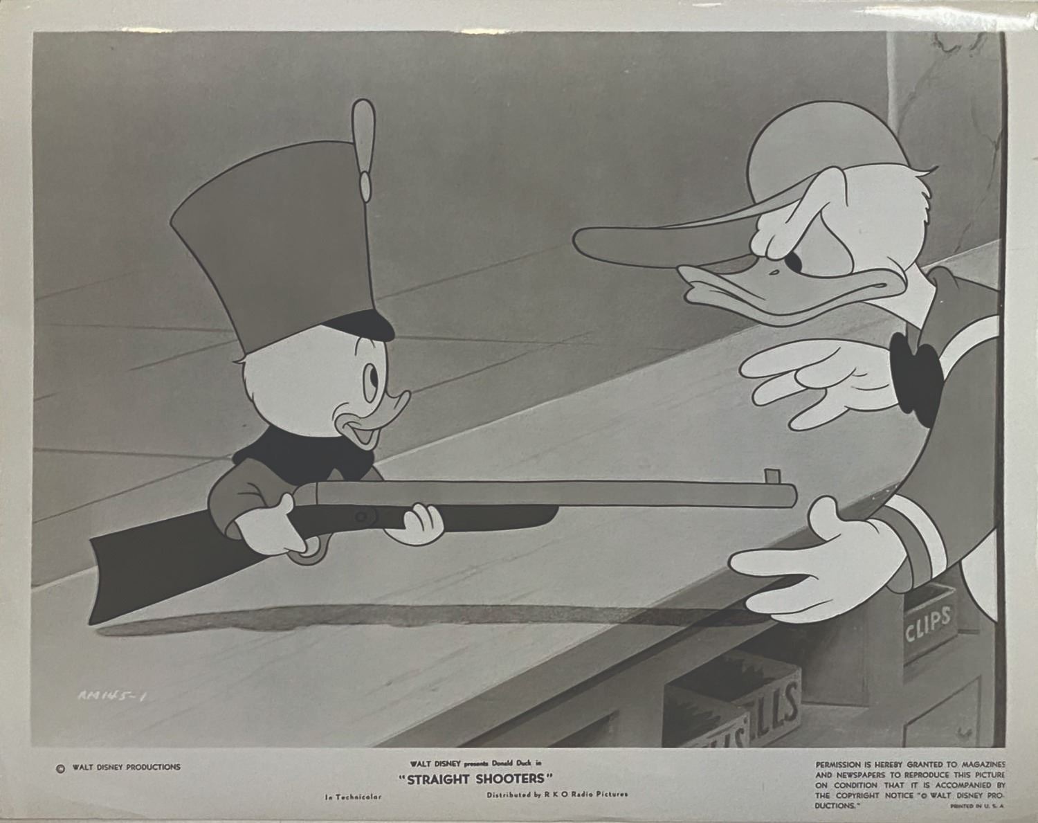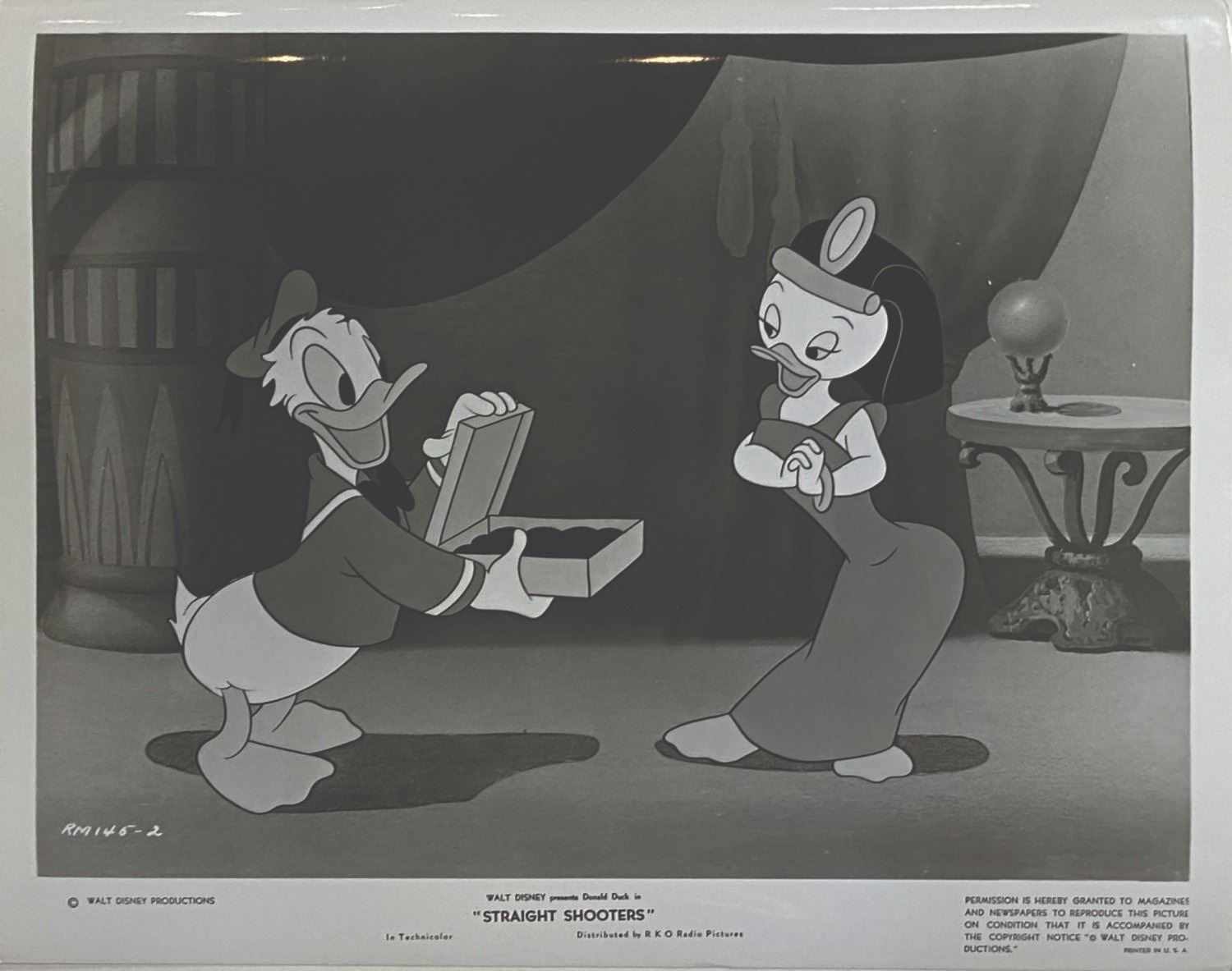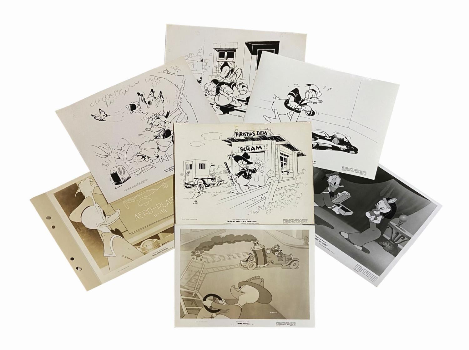 (Disney, 1938-53) A collection of (15) vintage original gelatin silver glossy studio photos depicting scenes from Walt Disney RKO animated shorts starring Donald Duck. The films include such classics as Self Control, Donald's Lucky Day, and Donald's Tire Trouble. Two of the photos are muslin-backed keybook stills. All measures approximately 8"x10" and are in generally good or very good condition, with some handling and wear from use.
