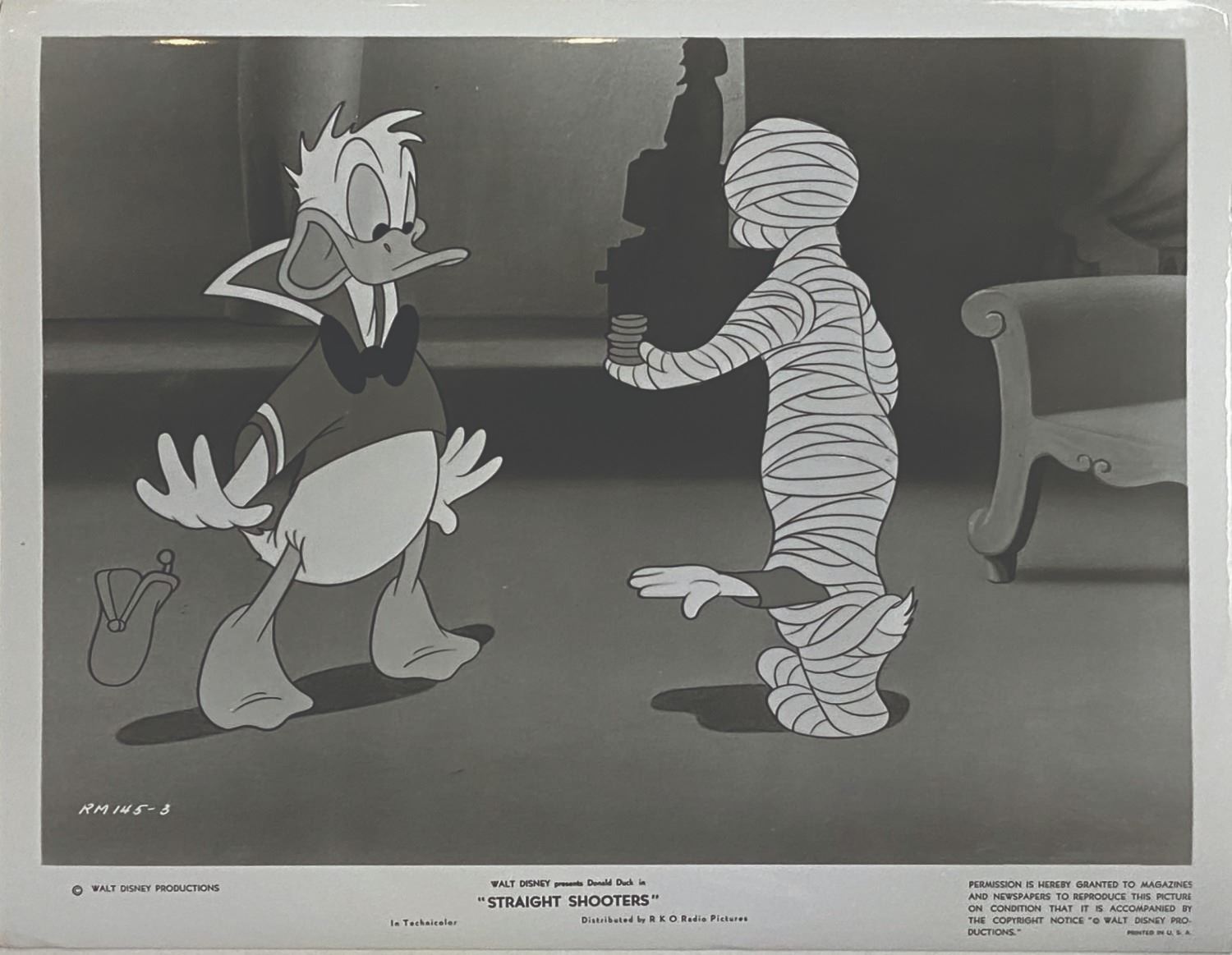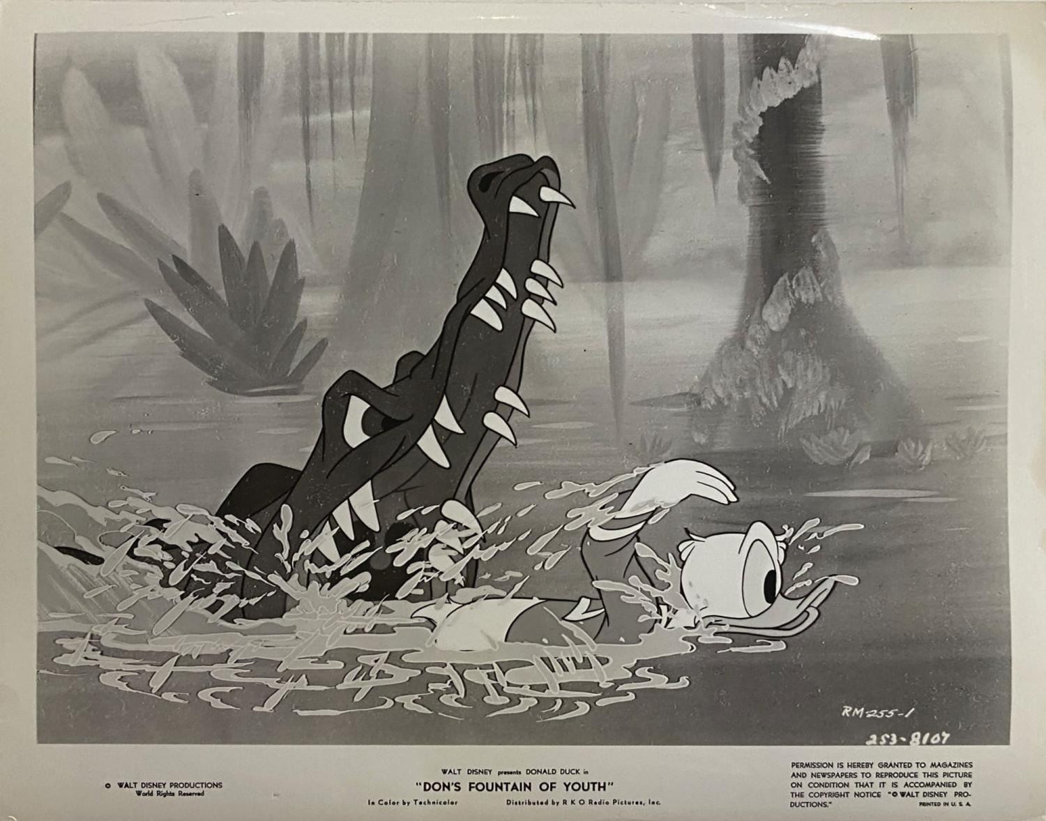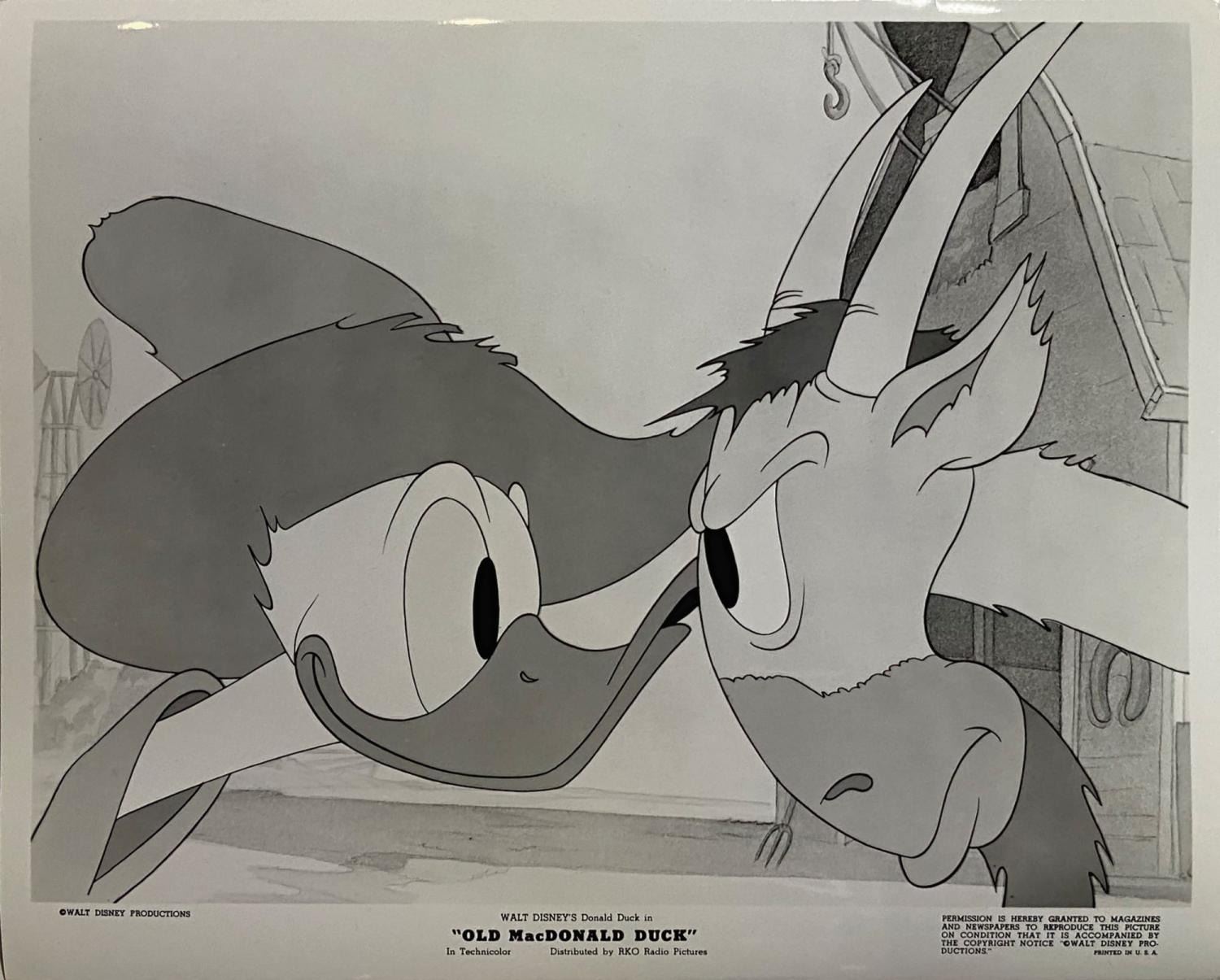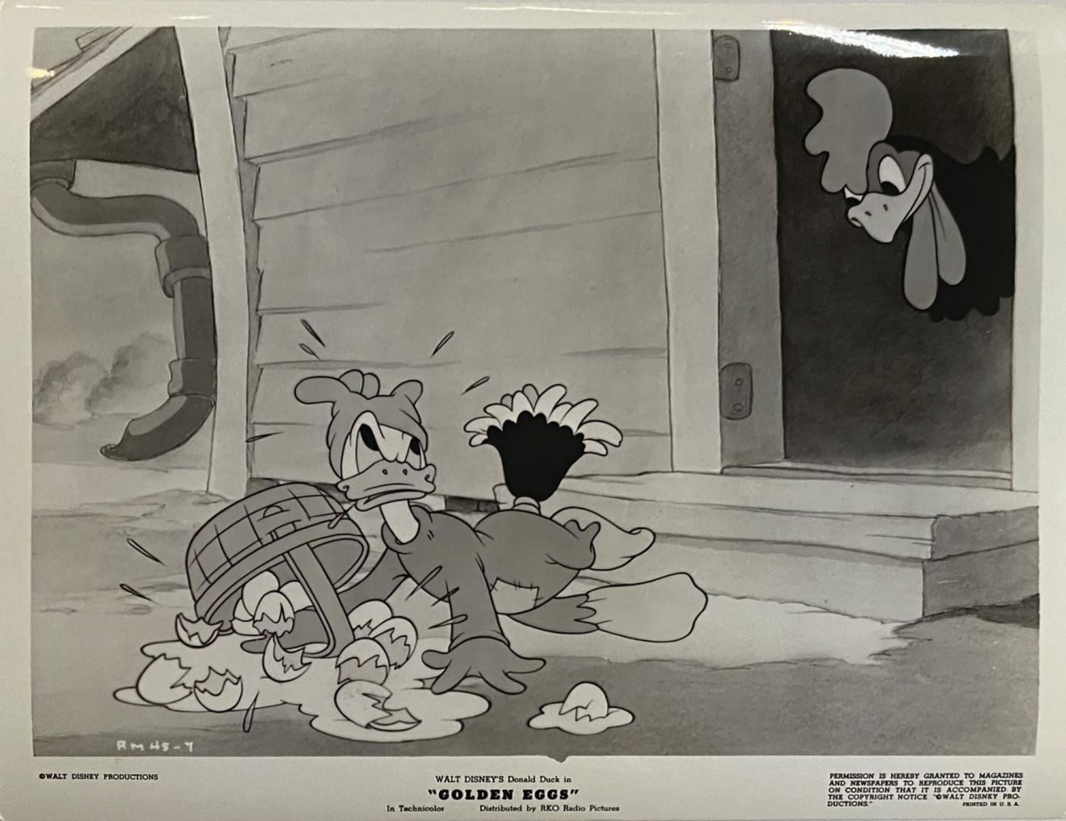 (Disney, 1938-53) A collection of (15) vintage original gelatin silver glossy studio photos depicting scenes from Walt Disney RKO animated shorts starring Donald Duck. The films include such classics as Self Control, Donald's Lucky Day, and Donald's Tire Trouble. Two of the photos are muslin-backed keybook stills. All measures approximately 8"x10" and are in generally good or very good condition, with some handling and wear from use.