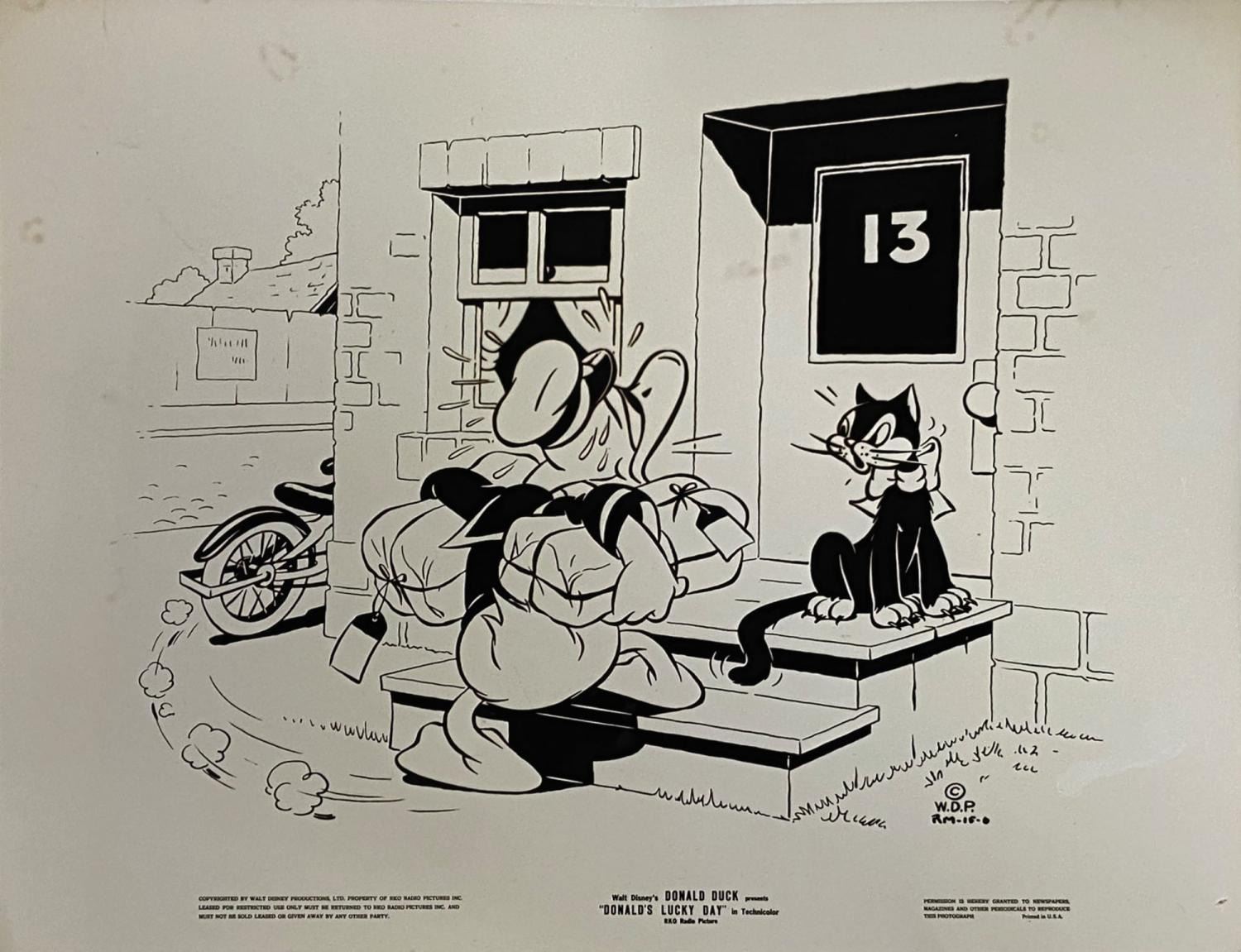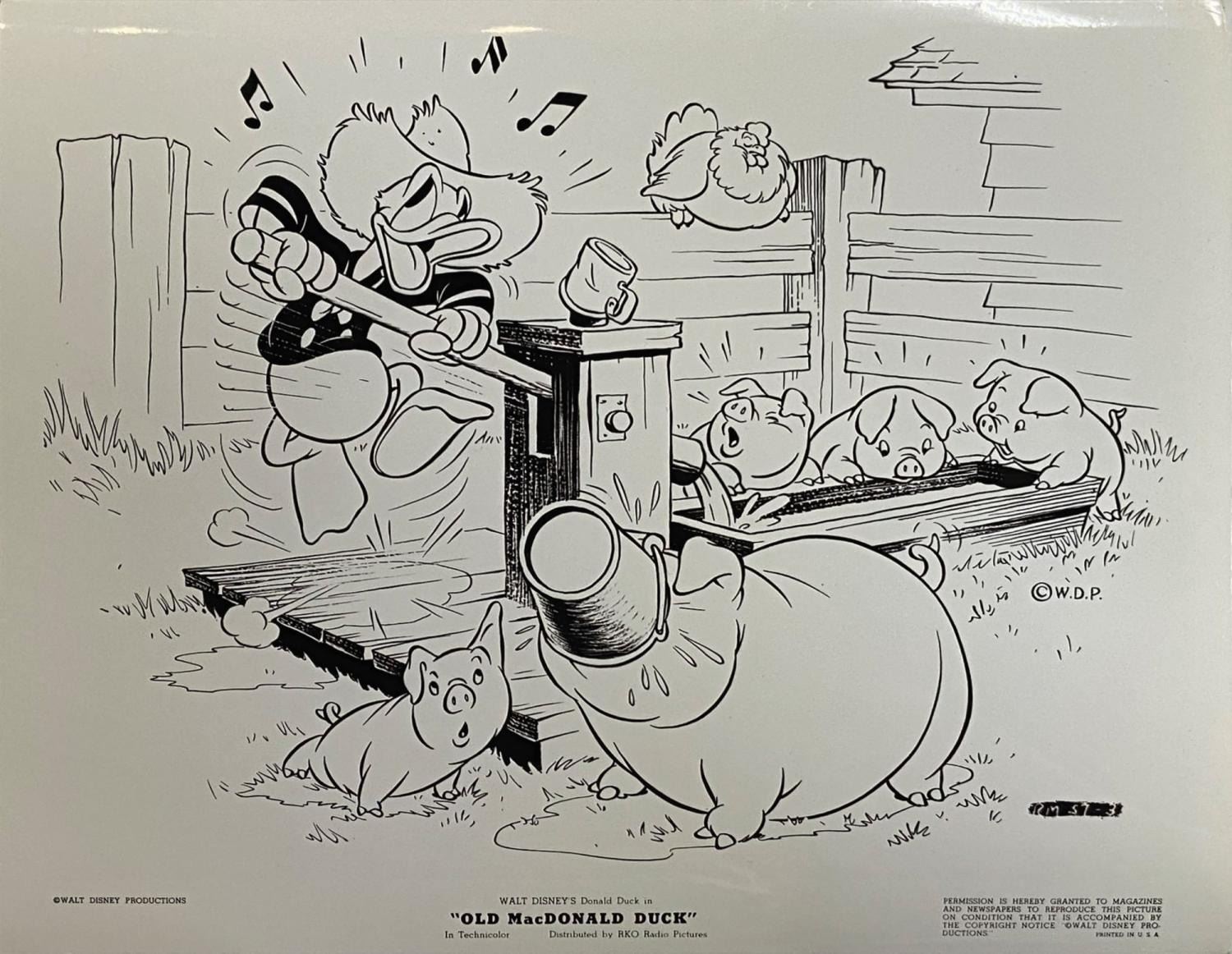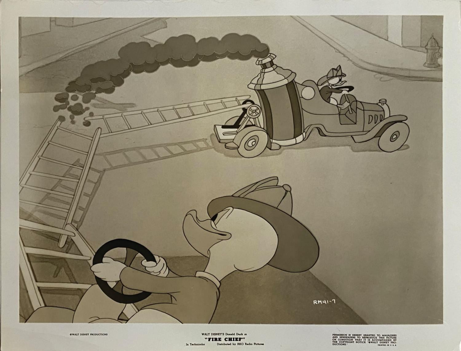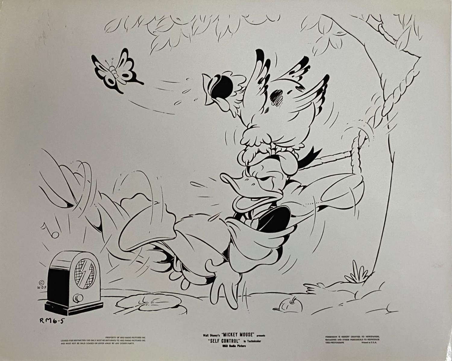 (Disney, 1938-53) A collection of (15) vintage original gelatin silver glossy studio photos depicting scenes from Walt Disney RKO animated shorts starring Donald Duck. The films include such classics as Self Control, Donald's Lucky Day, and Donald's Tire Trouble. Two of the photos are muslin-backed keybook stills. All measures approximately 8"x10" and are in generally good or very good condition, with some handling and wear from use.
