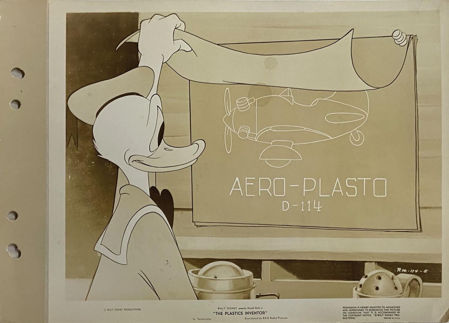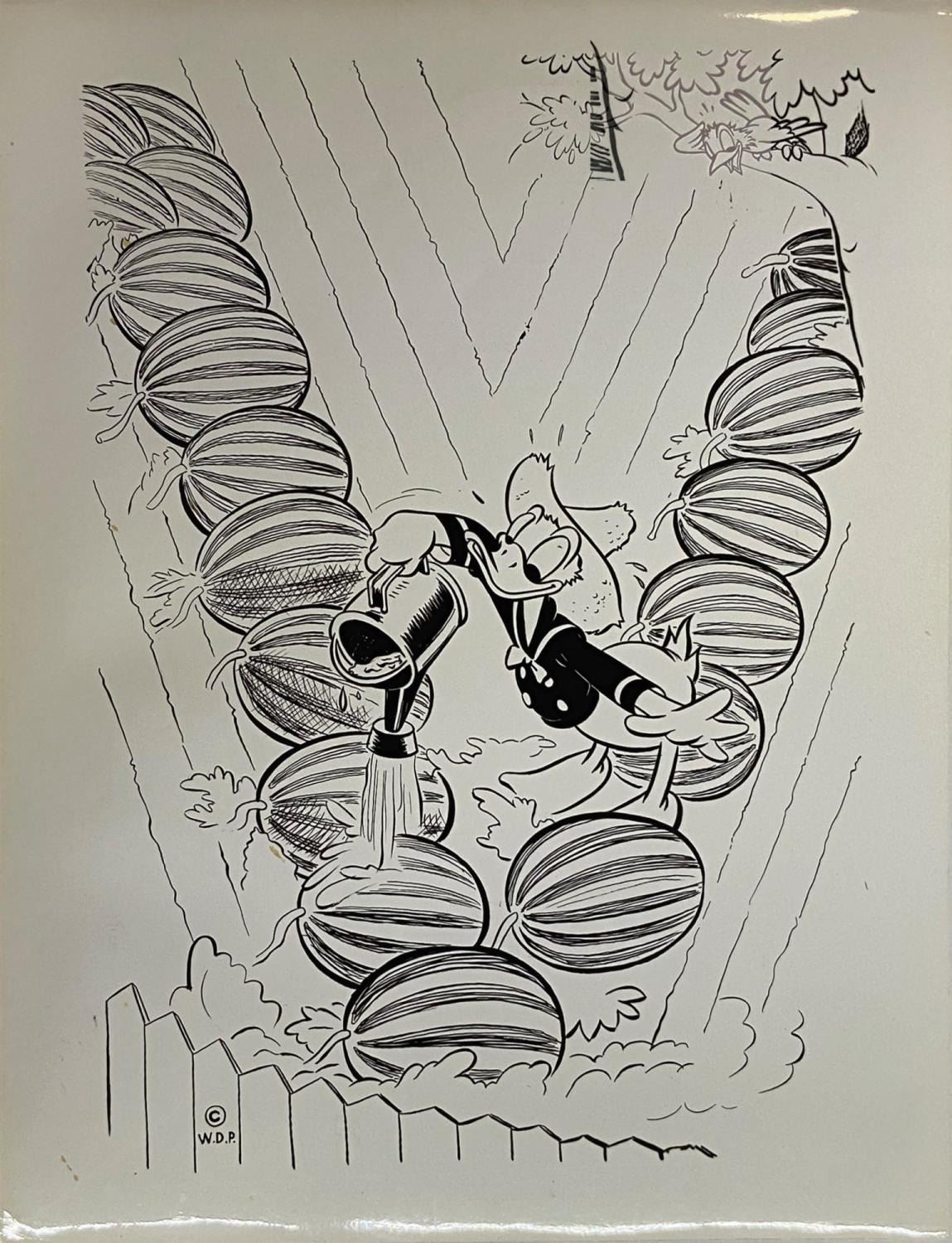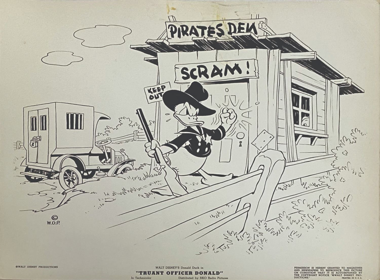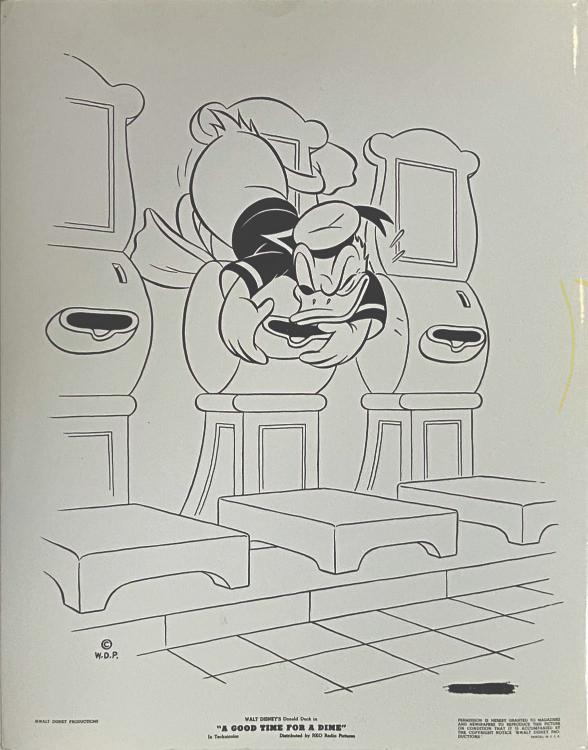 (Disney, 1938-53) A collection of (15) vintage original gelatin silver glossy studio photos depicting scenes from Walt Disney RKO animated shorts starring Donald Duck. The films include such classics as Self Control, Donald's Lucky Day, and Donald's Tire Trouble. Two of the photos are muslin-backed keybook stills. All measures approximately 8"x10" and are in generally good or very good condition, with some handling and wear from use.