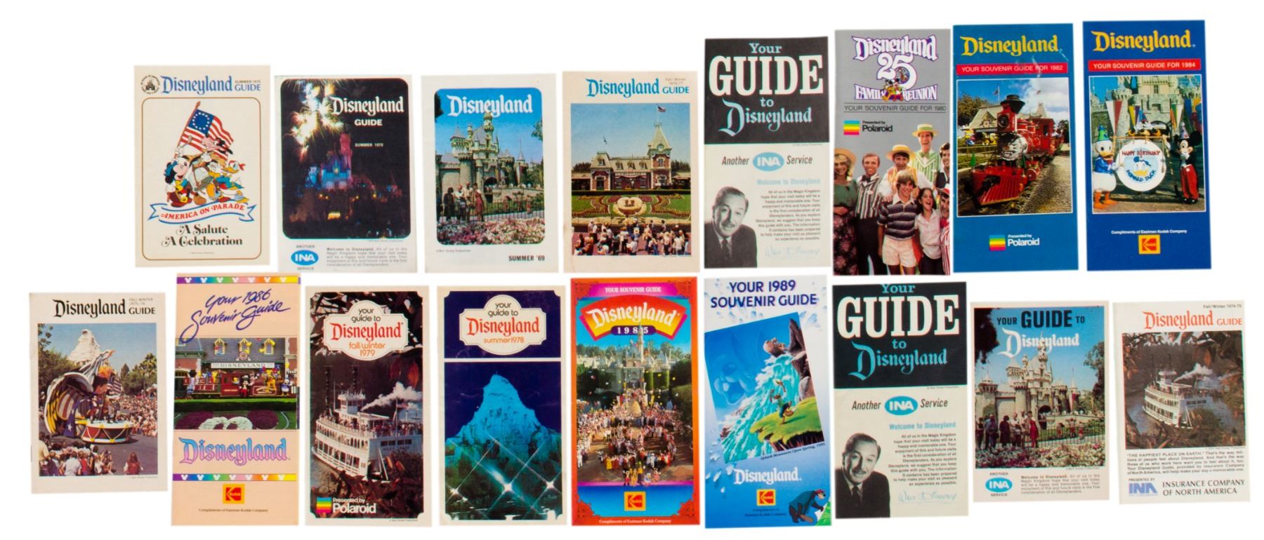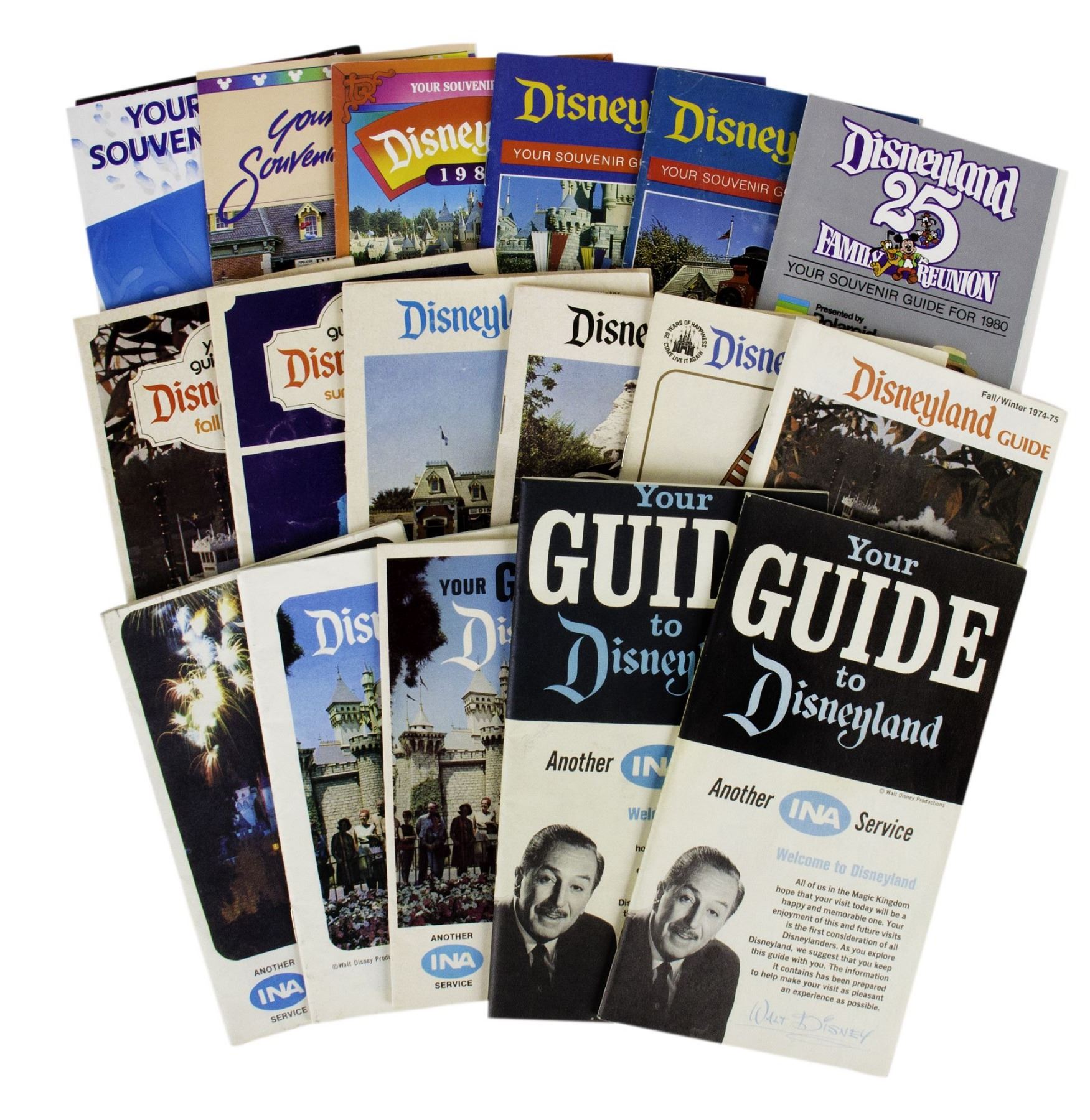 (Disneyland, 1965-89) A collection of (17) Disneyland guidebooks created between 1965 and 1989. These guide books list the attractions and entertainment available at the park during the years they were created, and provide a great summary of the park's history. The set includes guides for 1965, 1966, 1967, 1969, 1970, 1974, 1975, 1975/76, 1976/77, 1978, 1979, 1980, 1982, 1984, 1985, 1986, and 1989. The guides are in good condition with some edge-wear from use.