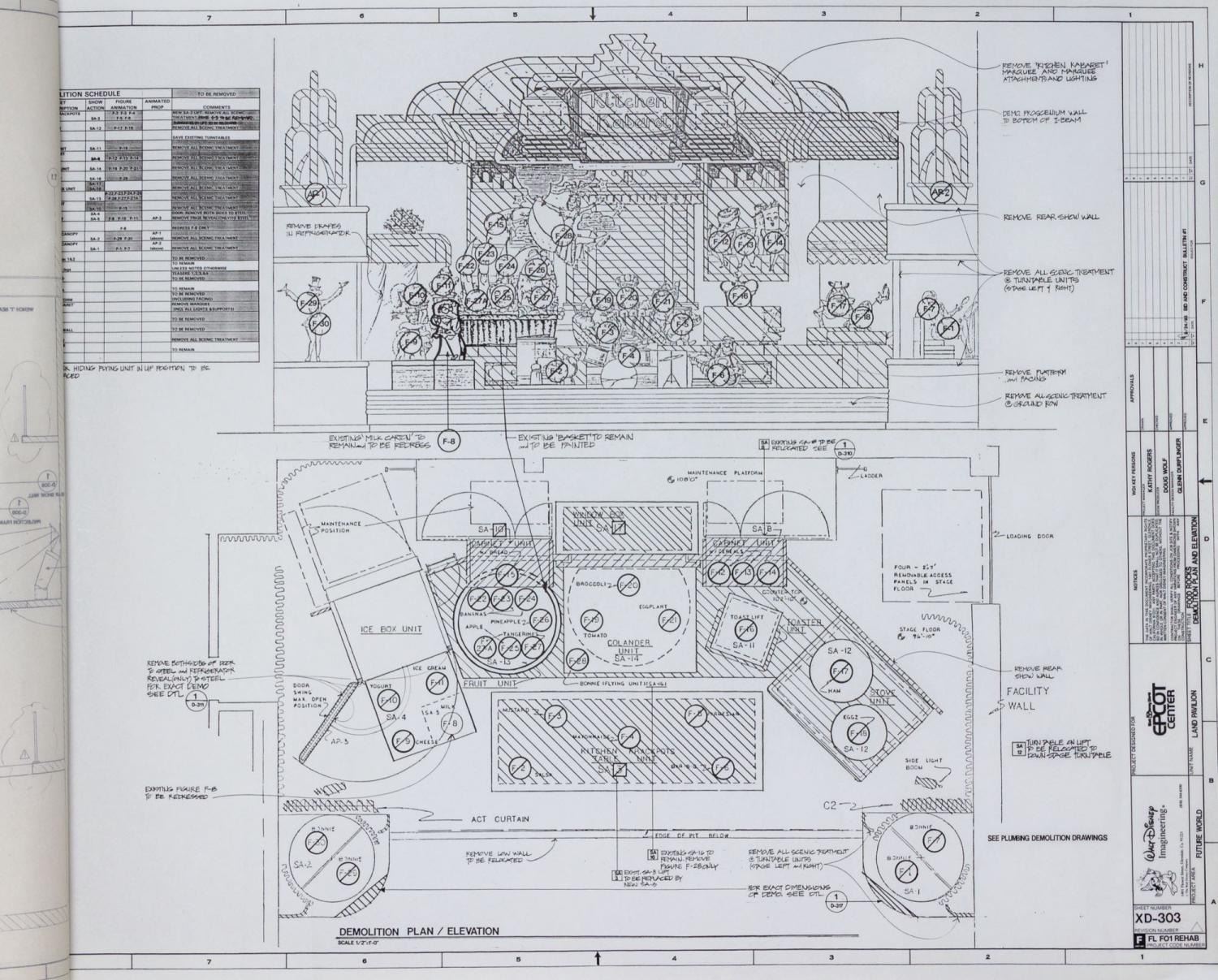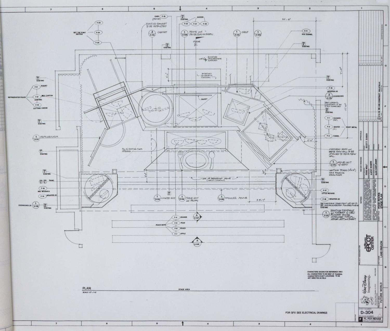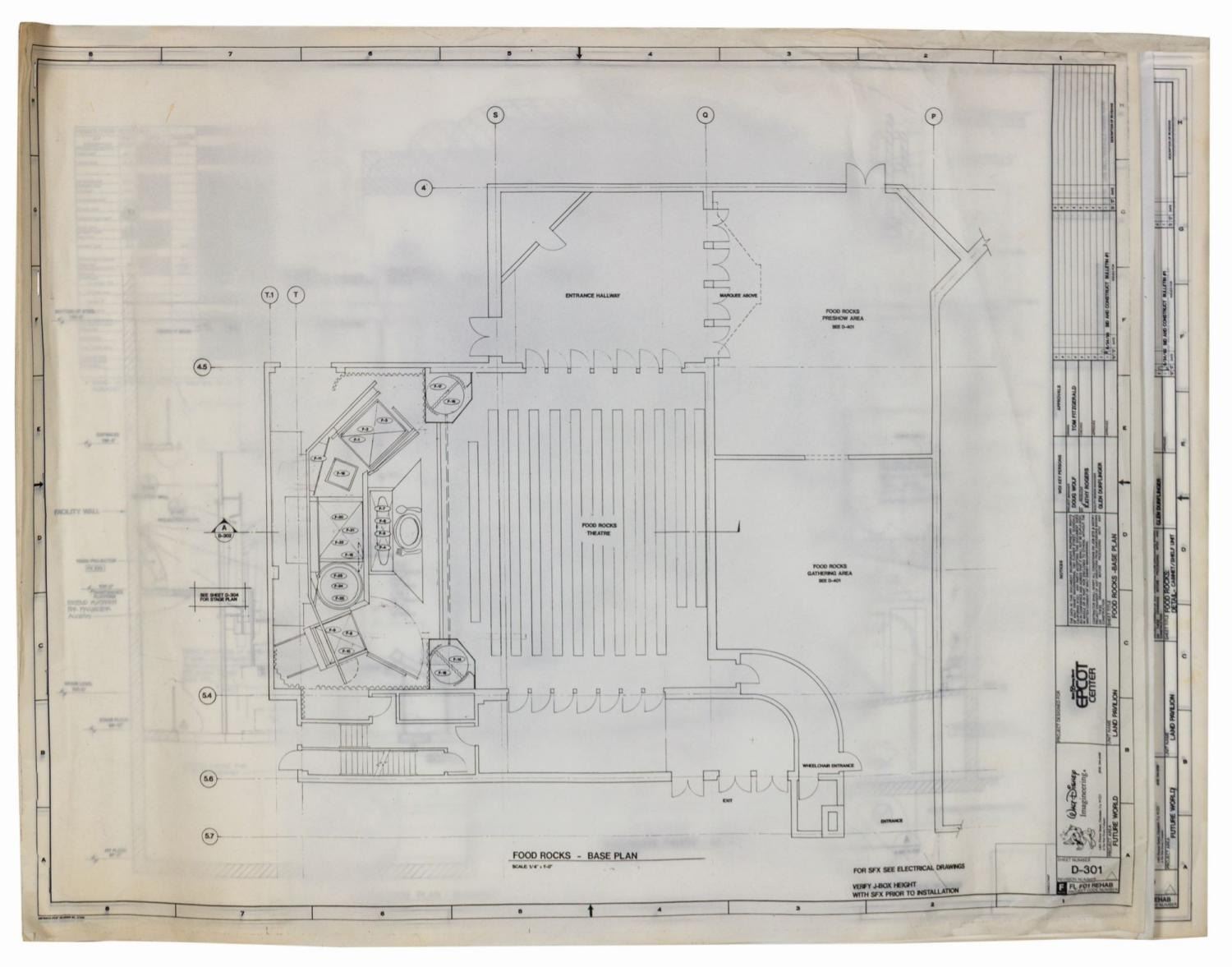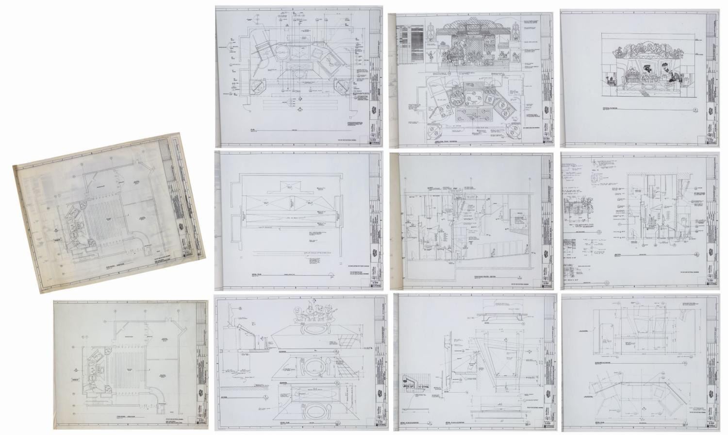 (Epcot, 1993) A set of (17) architectural plans created by Walt Disney Imagineering for the conversion of the Kitchen Kabaret audio-animatronic attraction into Food Rocks at The Land Pavilion in Epcot's Future World. The vellum prints are staple-bound at the left edge and depict various areas and steps of the project, including a demolition plan, different parts of the stage, elevations of the stage, and details of table, cookbook, and the show's marquee. Providing interesting insight into creation of the attraction, the book of plans measures 13"2.35" and is in good condition with minor handling wear typical of the medium.