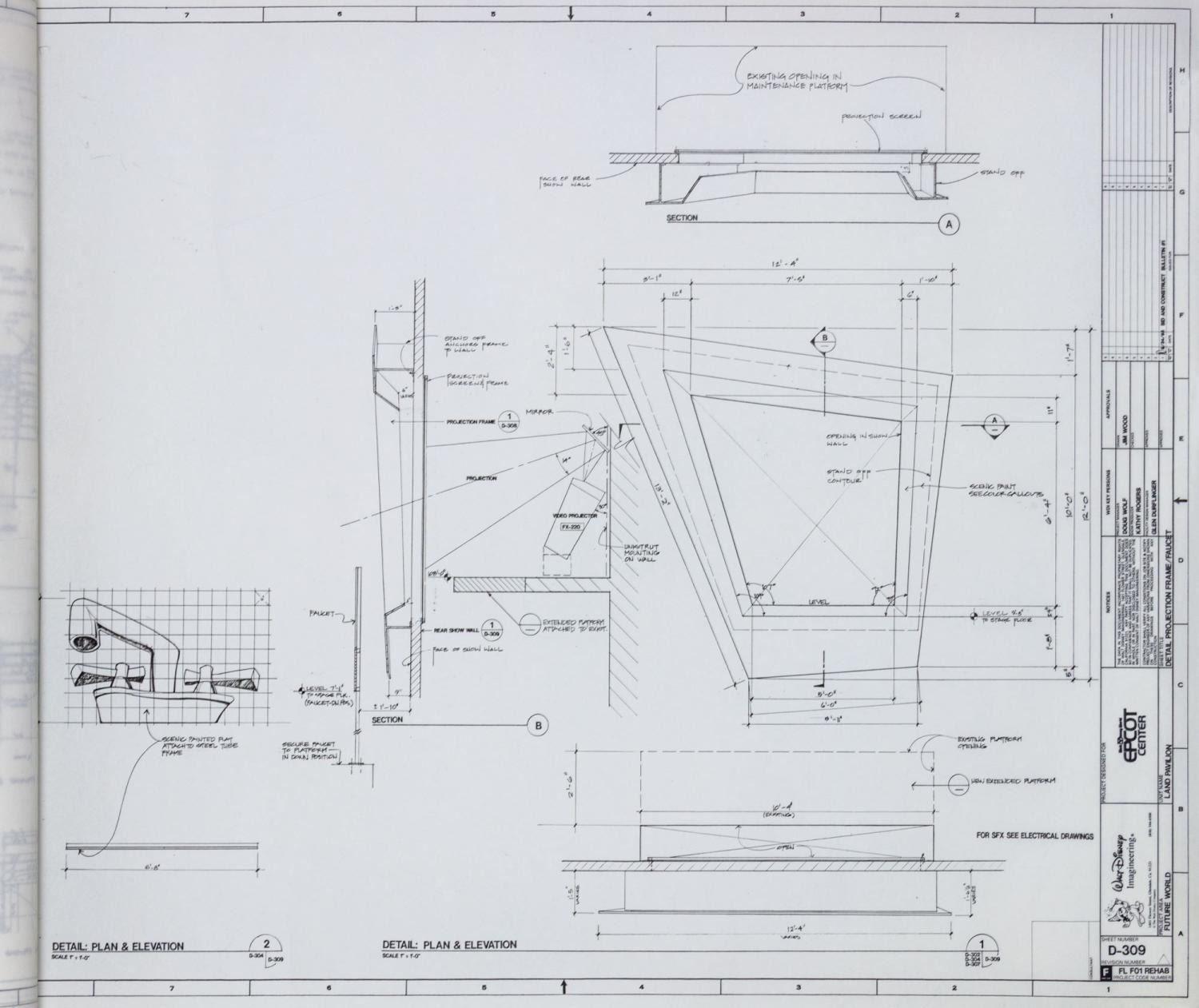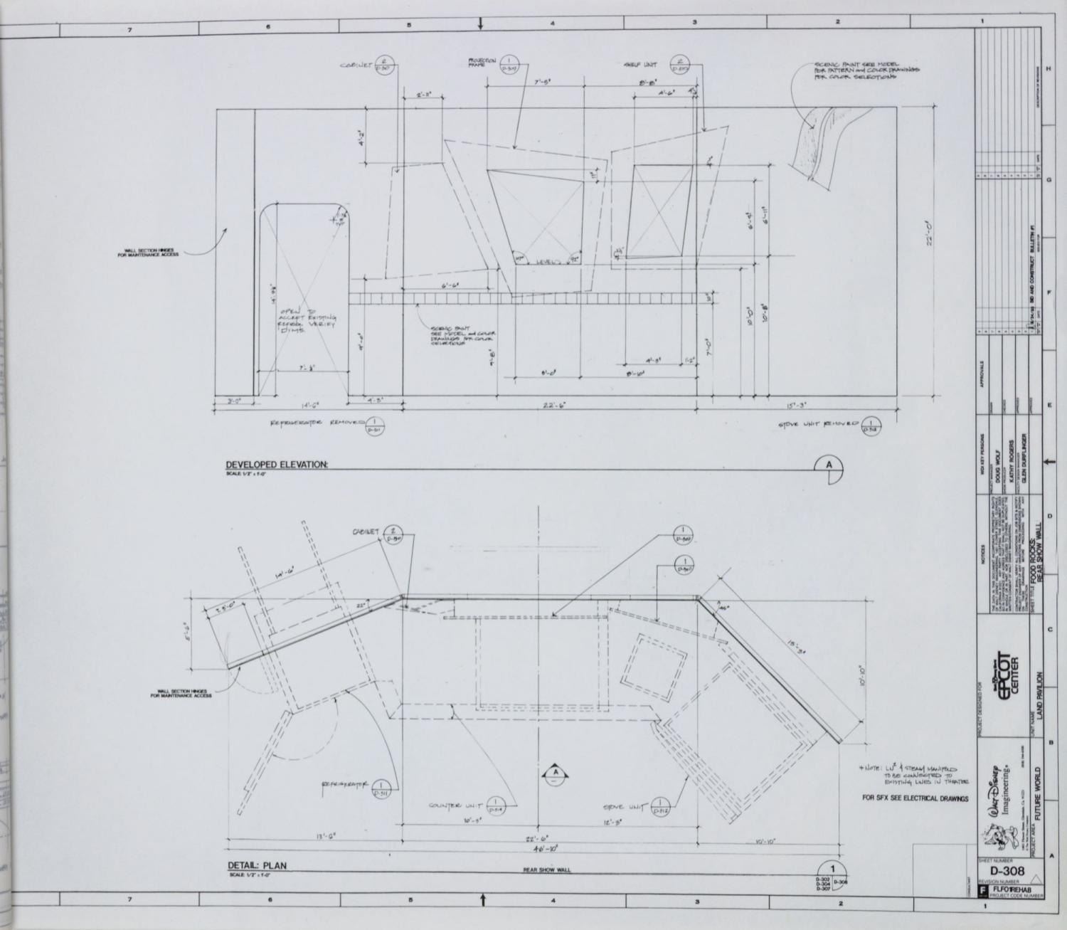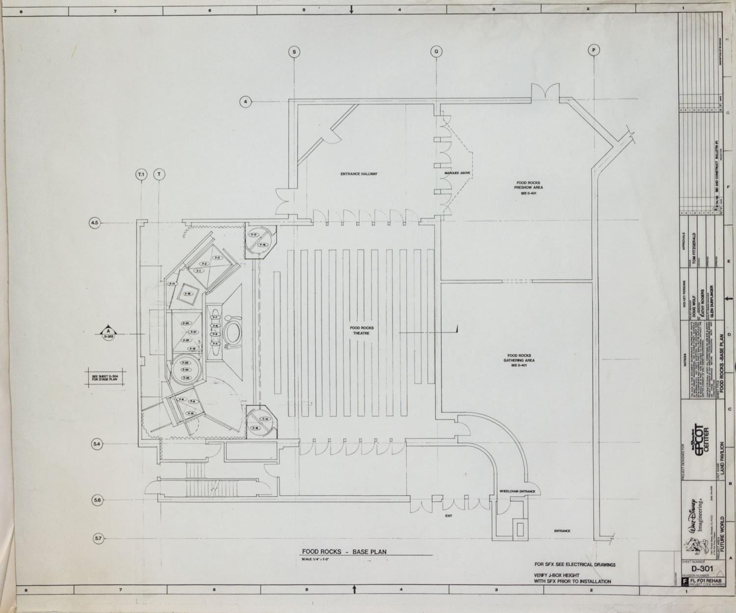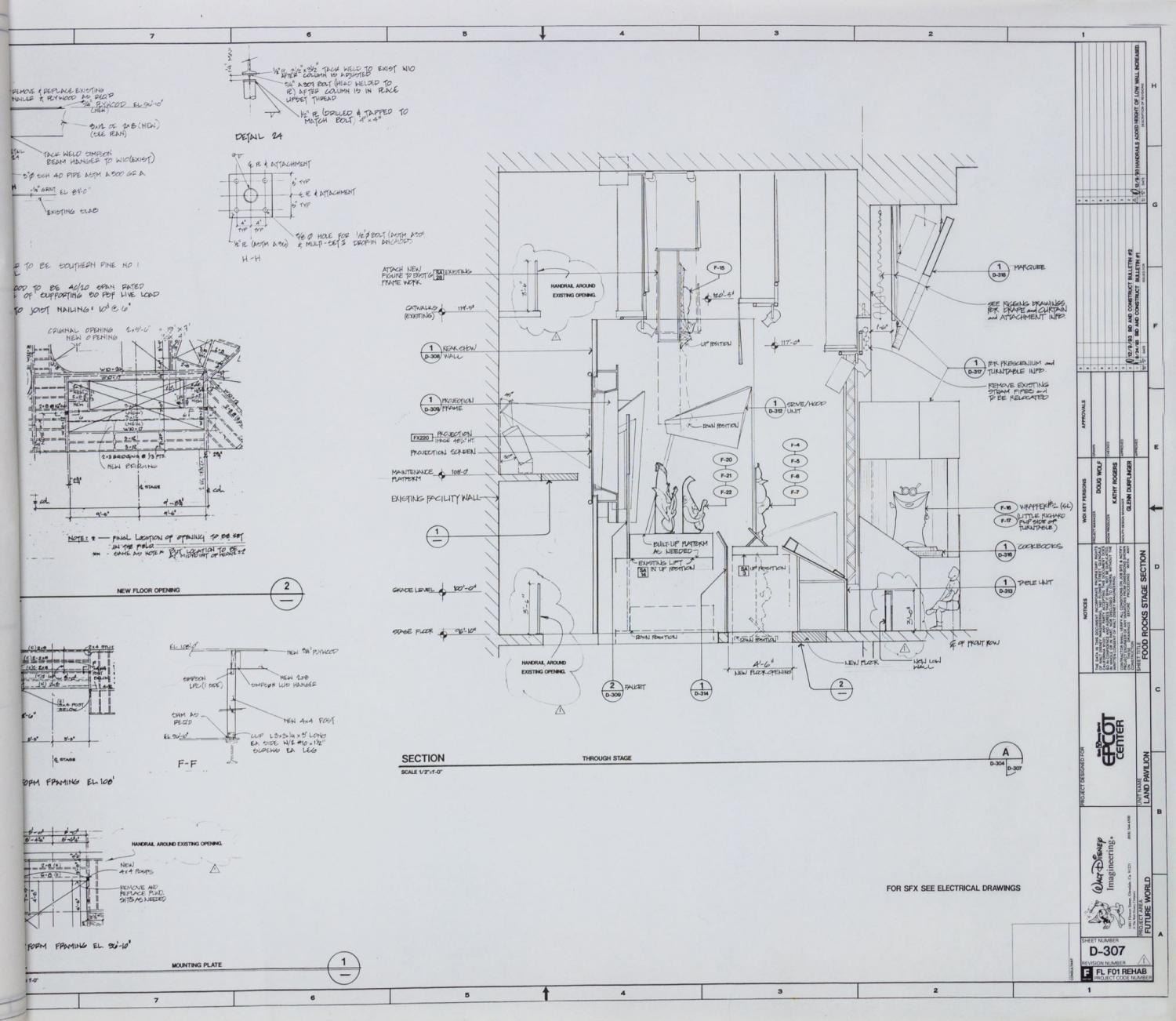 (Epcot, 1993) A set of (17) architectural plans created by Walt Disney Imagineering for the conversion of the Kitchen Kabaret audio-animatronic attraction into Food Rocks at The Land Pavilion in Epcot's Future World. The vellum prints are staple-bound at the left edge and depict various areas and steps of the project, including a demolition plan, different parts of the stage, elevations of the stage, and details of table, cookbook, and the show's marquee. Providing interesting insight into creation of the attraction, the book of plans measures 13"2.35" and is in good condition with minor handling wear typical of the medium.