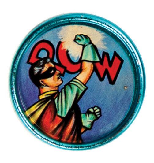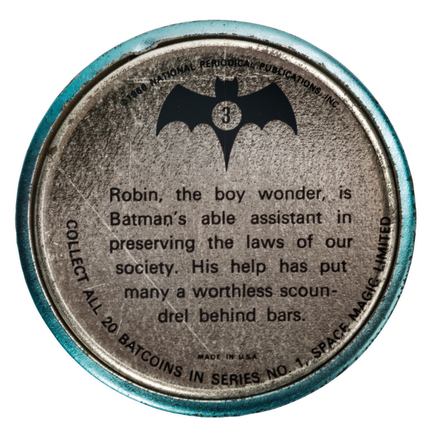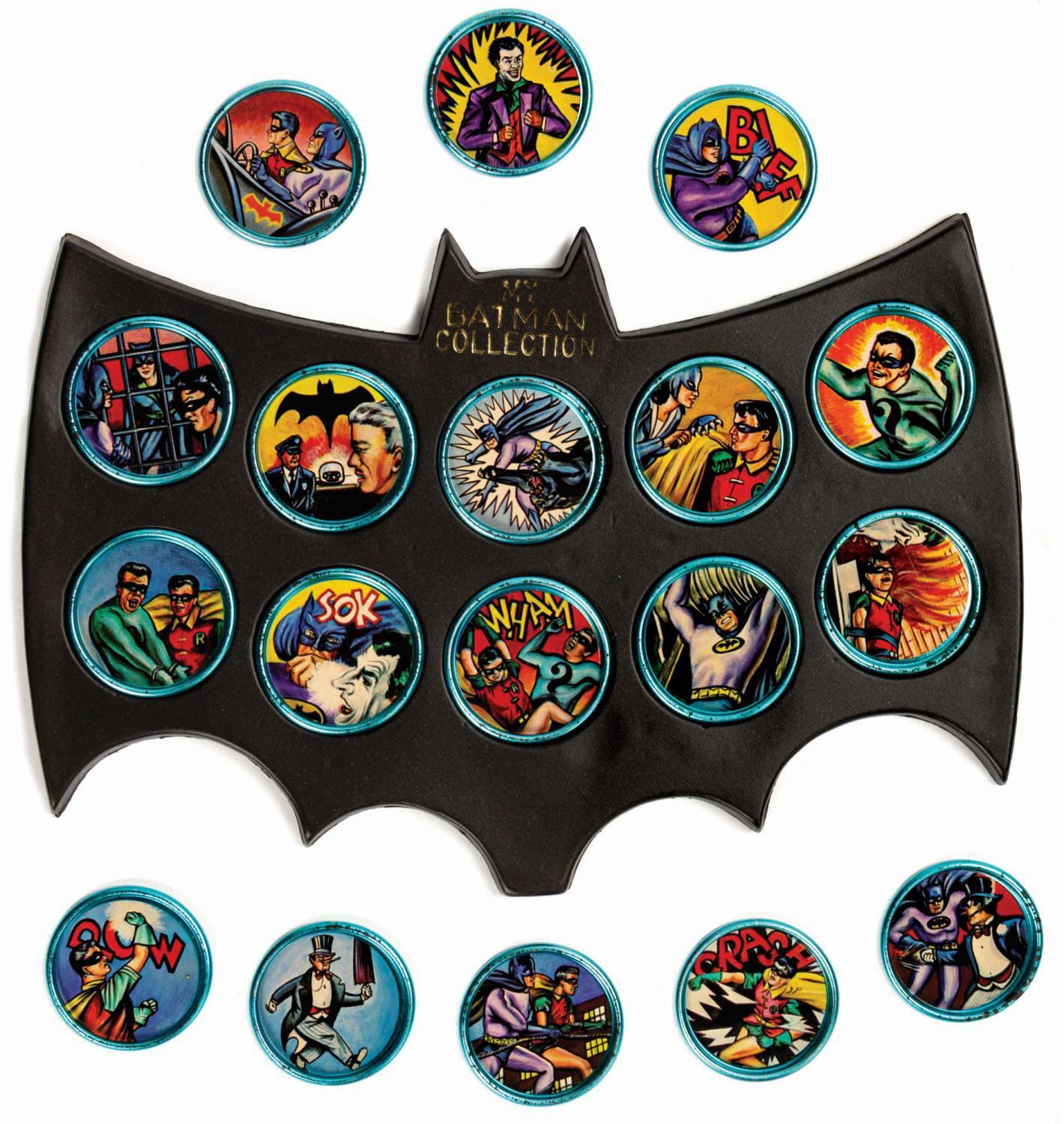 (ABC, 1966) A collection of (18) "Batcoins" and a pair of bat-shaped displays created to promote the Batman TV show. Each coin shows a recessed image of the heroes and villains of the Batman series, featuring characters such as Batman, Robin, the Riddler, the Joker, Catwoman, and more. A caption for each image is printed on the reverse, along with its number within the series. Measuring 1.5" diameter, the metal coins fit into the 6"x8.75" holders with (10) circular depressions for display. The condition is good overall, with surface wear around the rim of the coins where the color has worn off. Coins #1 and #8 are missing from the collection.