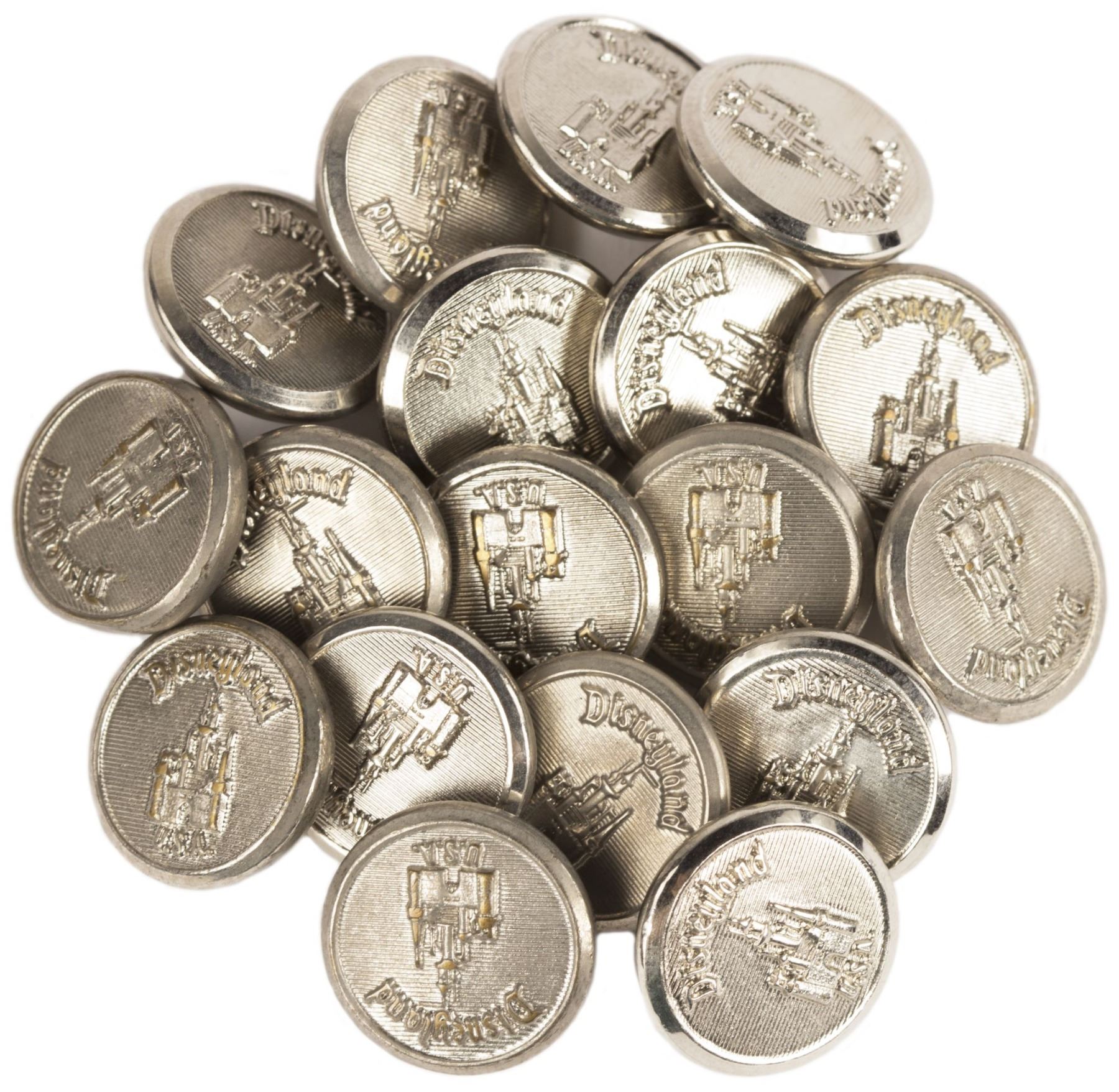 (Disneyland, c.1970s) A collection of (18) metal buttons created for cast member wardrobe items in the 1970s. The buttons feature the logo and name of their respective parks and are a subtle and functional piece of Disney Theme Park history. The buttons measure just over 0.5" in diameter and are in very good condition overall.