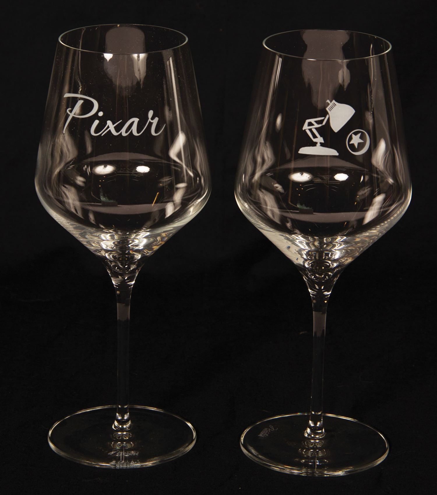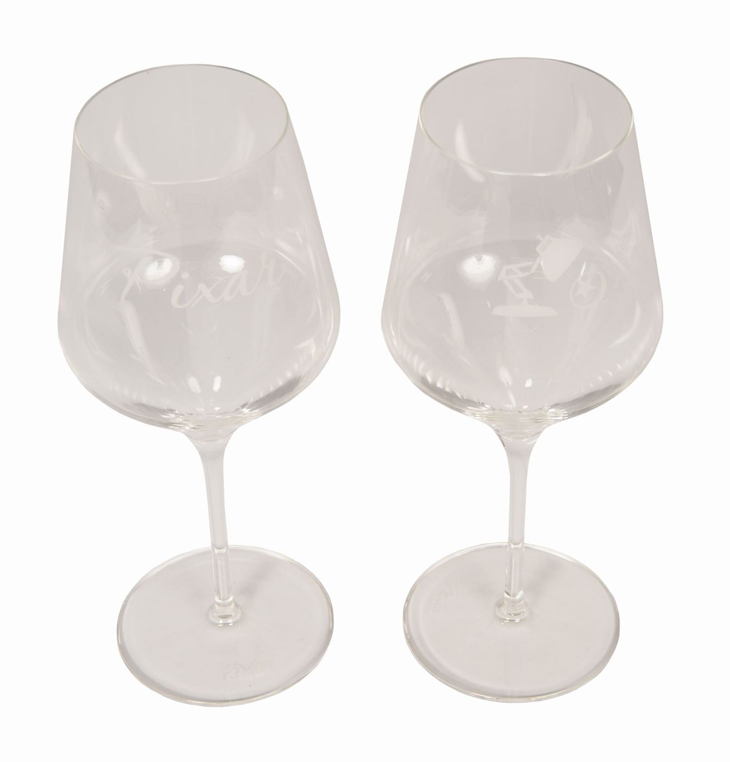 (Pixar, c.2010s) A rare pair of Pixar wineglasses manufactured by Master’s Reserve. The elegant, angular glasses are laser etched with Pixar logos. One features the ball and lamp graphic, and the other, a text logo. The set is accompanied by its original cardboard box packaging. Each glass measures 9.5”x4” in diameter and the set is in very fine condition being as-new.