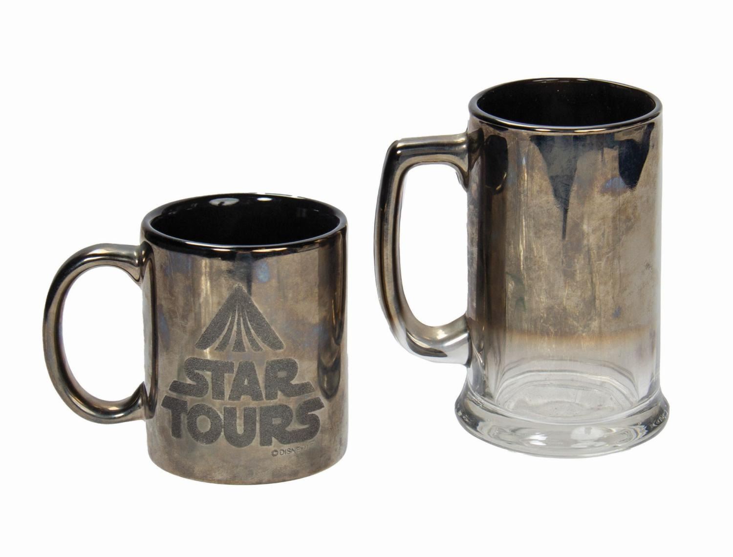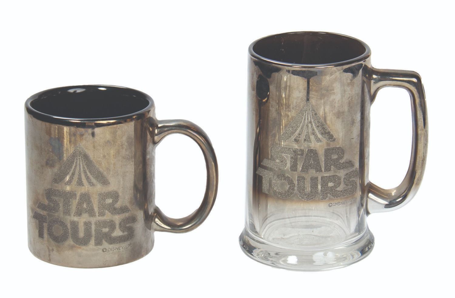 (Disneyland, c.1980s-90s) A set of (2) Star Tours souvenir mugs from Disneyland. The collection includes a handled ceramic coffee mug with a mirrored chrome finish and metallic Star Tours relief logos on either side and a handled glass beer mug with a 3/4 mirrored chrome finish and raised metallic Star Tours logos. Ranging in size from 4"x4.75" and 3.25" deep to 5.5"x4.25" and 3.25" deep, the pieces are in generally very good condition with minor surface and handling wear.