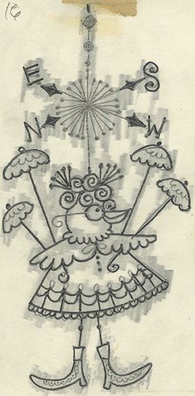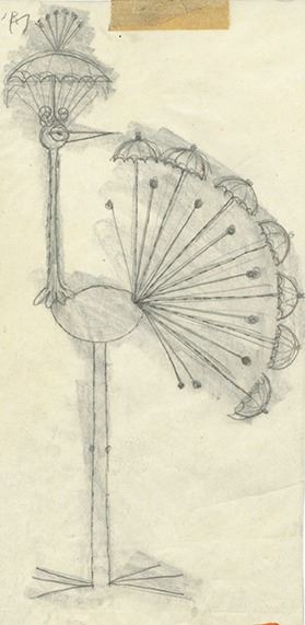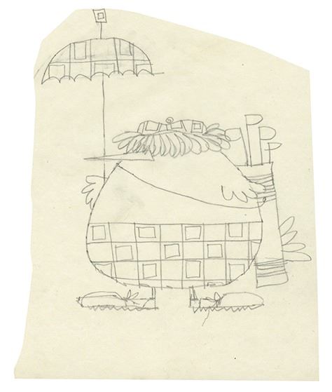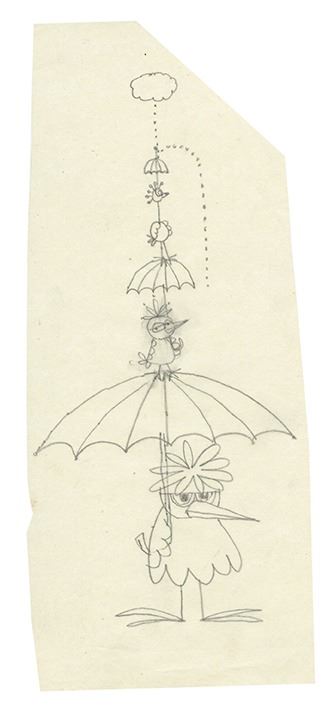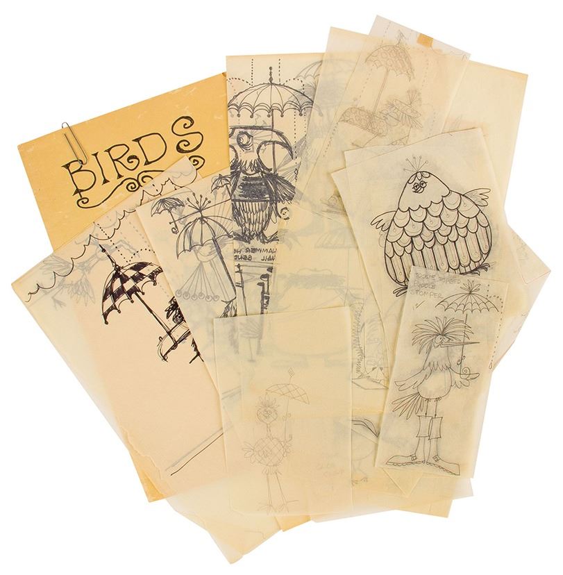(c.1970s) A set of 29 pages of illustrations by Rolly Crump for characters to be used in an exhibit for Rainbird Sprinklers. These humorous illustrations are accomplished in ink on vellum and were improved by Rolly based on his coworker Eddie Johnson's earlier sketches. Included in this set are 15 xeroxed sheets of Johnson's earlier sketches as well as a folder titled "Birds" in Rolly's iconic inked style. The set is in very good condition overall with minor wear from use.
