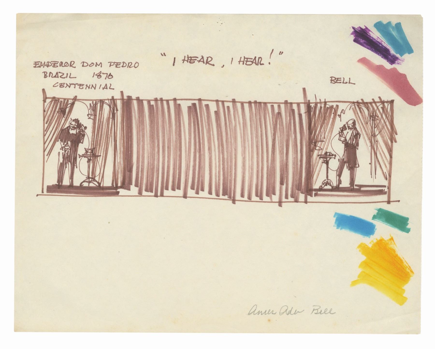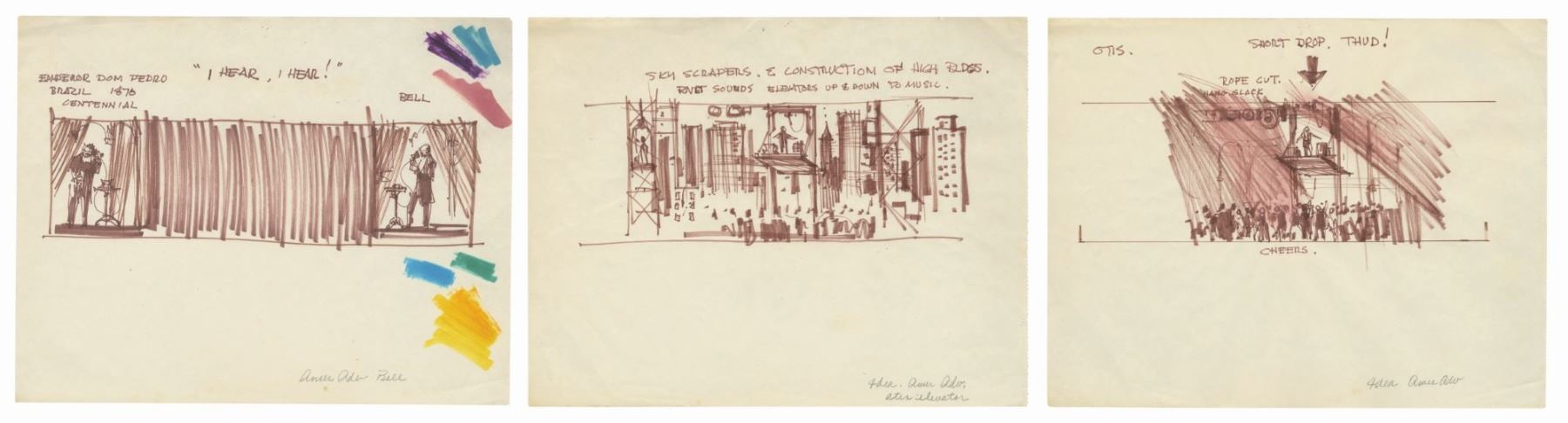(Epcot, c.1981) A set of (3) original drawings from the estate of Imagineer Clem Hall. These drawings were created during the development of Epcot's The American Adventure, and represent the scenes involving the demonstration of the Otis Elevator and Alexander Graham Bell's demonstration of the telephone. Accomplished in ink on thin art paper, the drawings measure 8.5"x11" and are in very good condition.