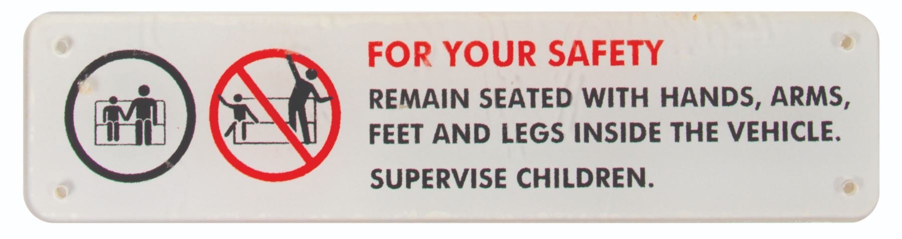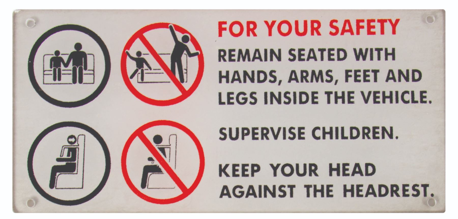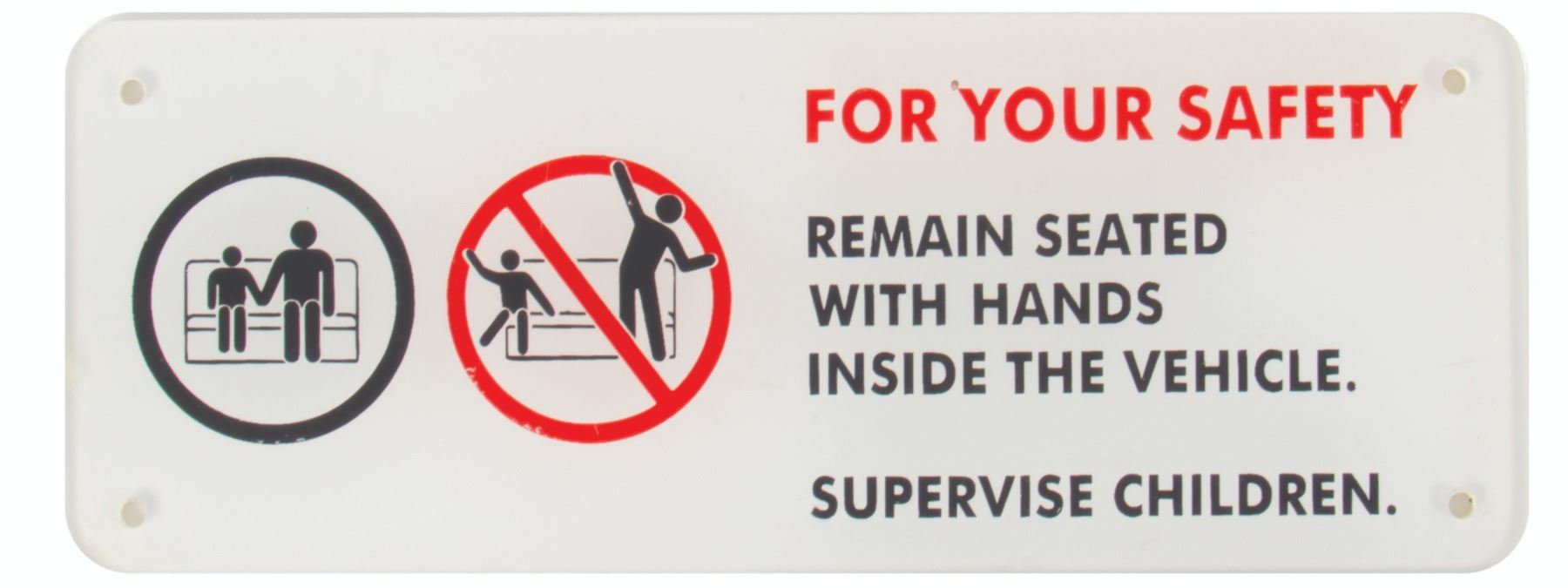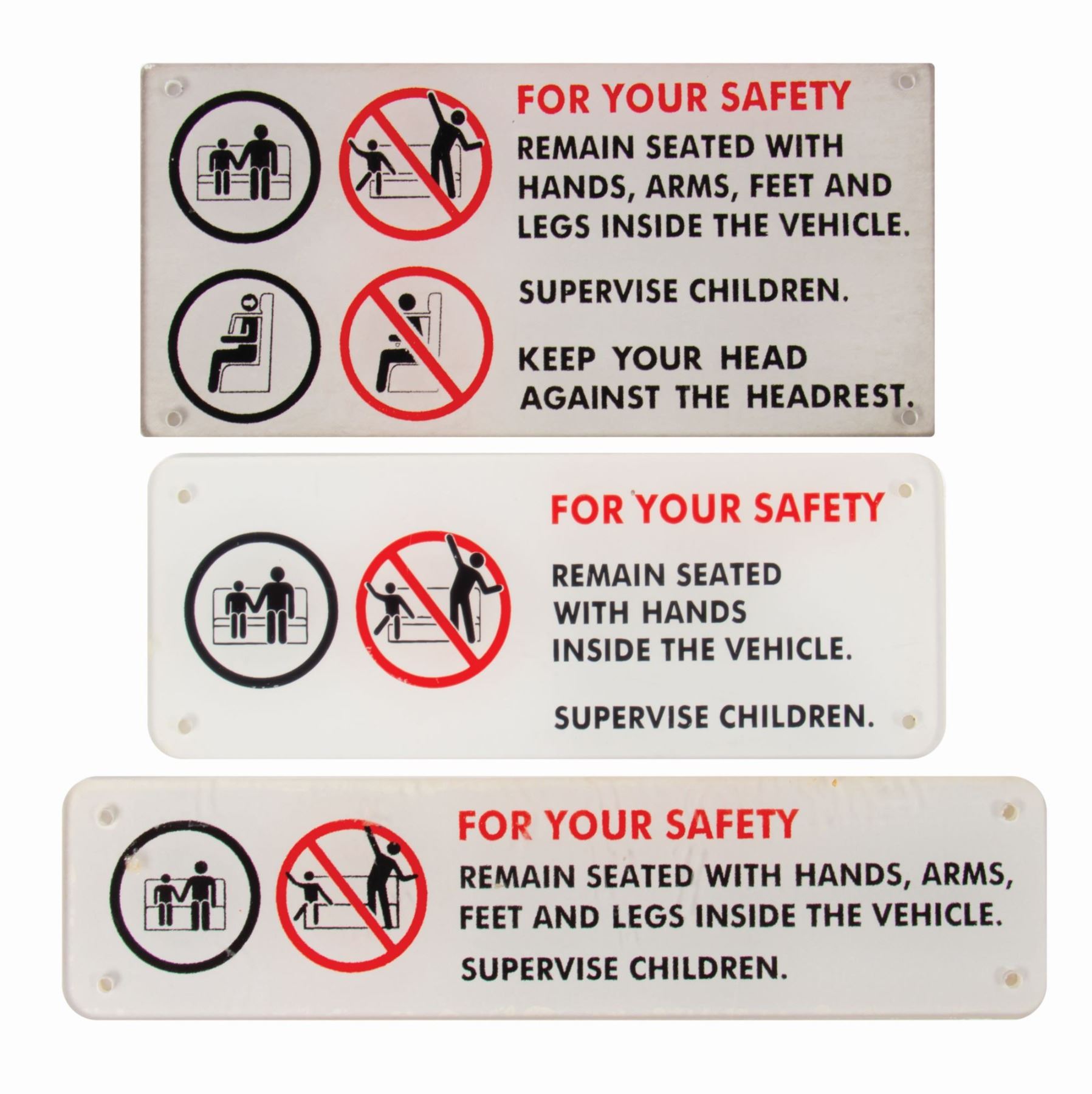 (Disneyland, c.1990s-2000s) A set of (3) Disneyland attraction vehicle safety signs. The signs feature three variants of the "For Your Safety" vehicle signs, with messages instructing guests to remain seated, supervise children, and to keep your head against the headrest. These signs are printed on acrylic board and range in size from 2" tall to 3.25" tall. The condition is good overall with signs of wear from park use including some small bubbles in some areas of the imagery, particularly around the edges of the longest sign.