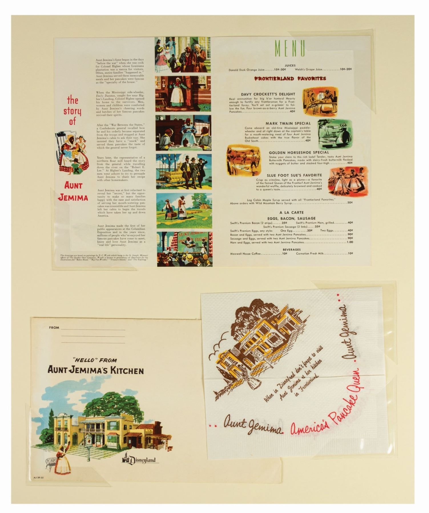 (Disneyland, c.1960) An original set of (3) paper items from Aunt Jemima's Kitchen in Frontierland. The set includes a menu, a napkin, and a very rare original envelope from the popular Disneyland location. The items are wonderfully displayed together with clear mounting corners that hold them in place on a 19.5"x15.5" board. The condition is good overall, with a worn patch on the front cover of the menu.